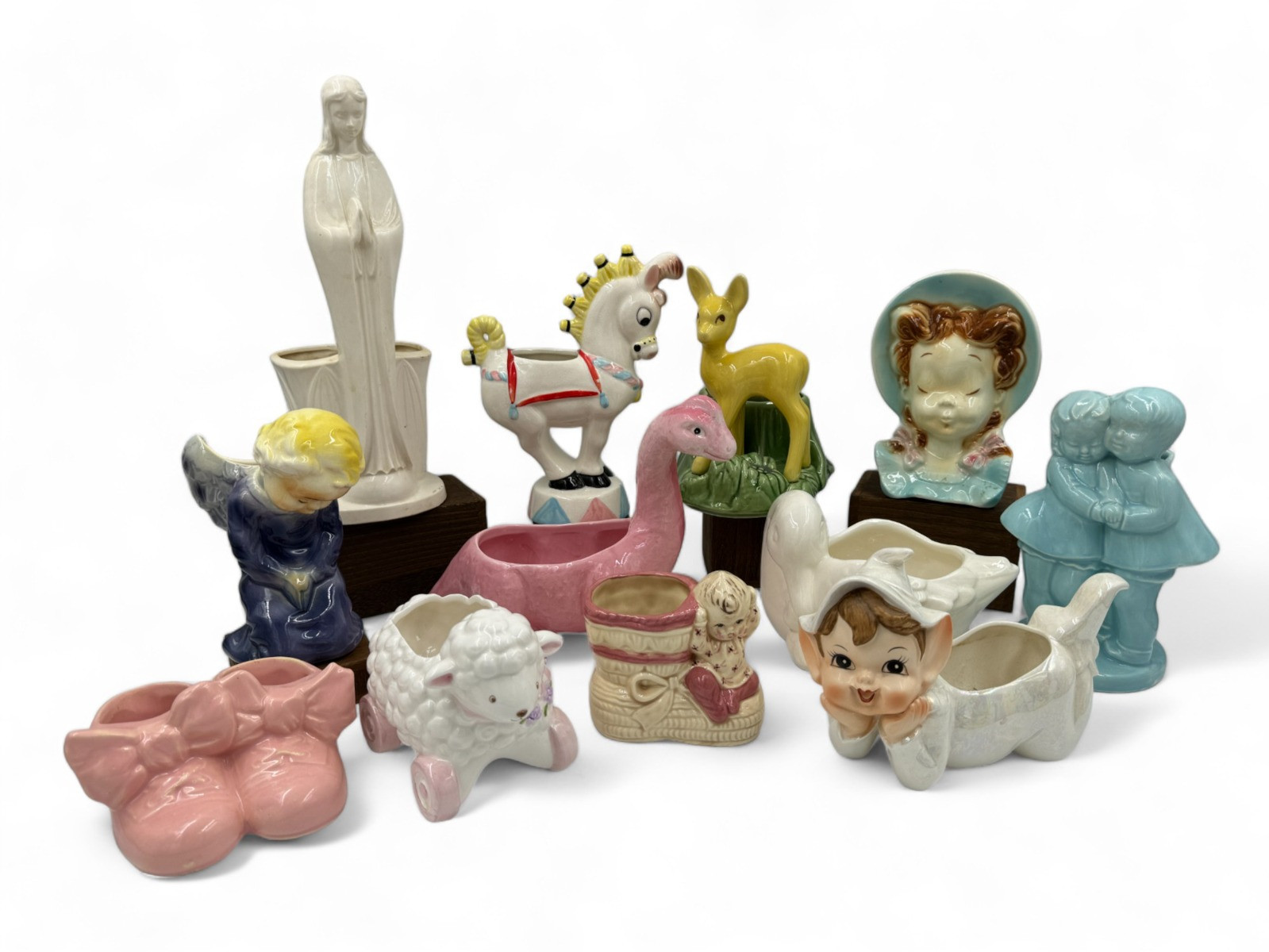 Vintage Kitschy Ceramic Planters - Lefton, Avon, Shawnee, Royal Copley Shortest 2"T Tallest 12"T - Napcoware Mary National potteries circus horse 8.75"T - has a hairline crack on the side Shawnee pottery 7"T Deer on grass Royal Copley 6.75"T Angel has repaired head