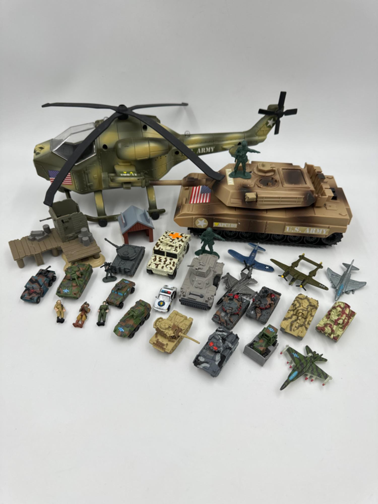 Smallest vehicle is approximately 1.25” Largest is the helicopter - 13"L Both tank and helicopter are untested