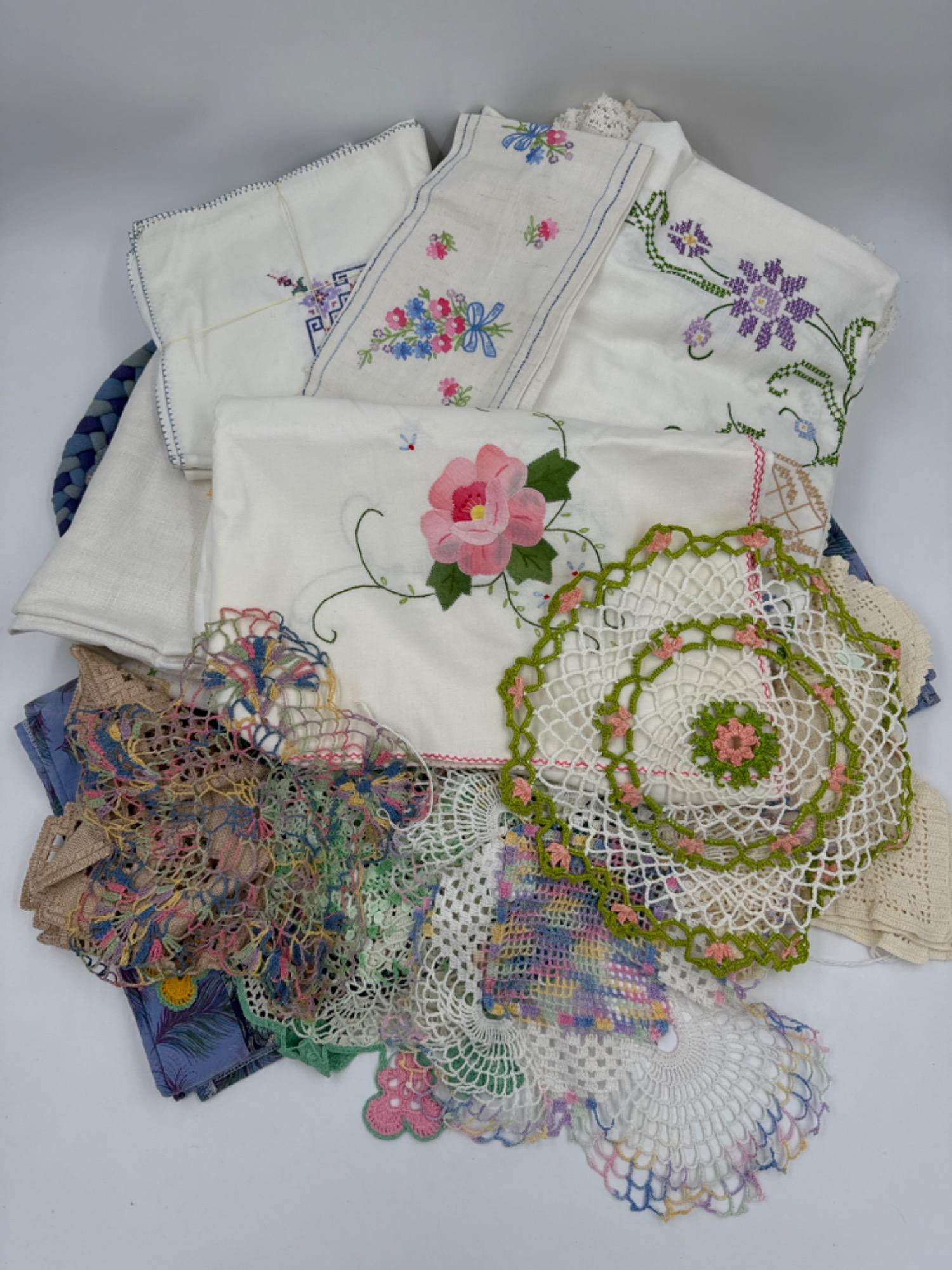 Lots of Lovely Linens Vintage Cross Stitch & Embroidery + Doilies Majority appear well cared for