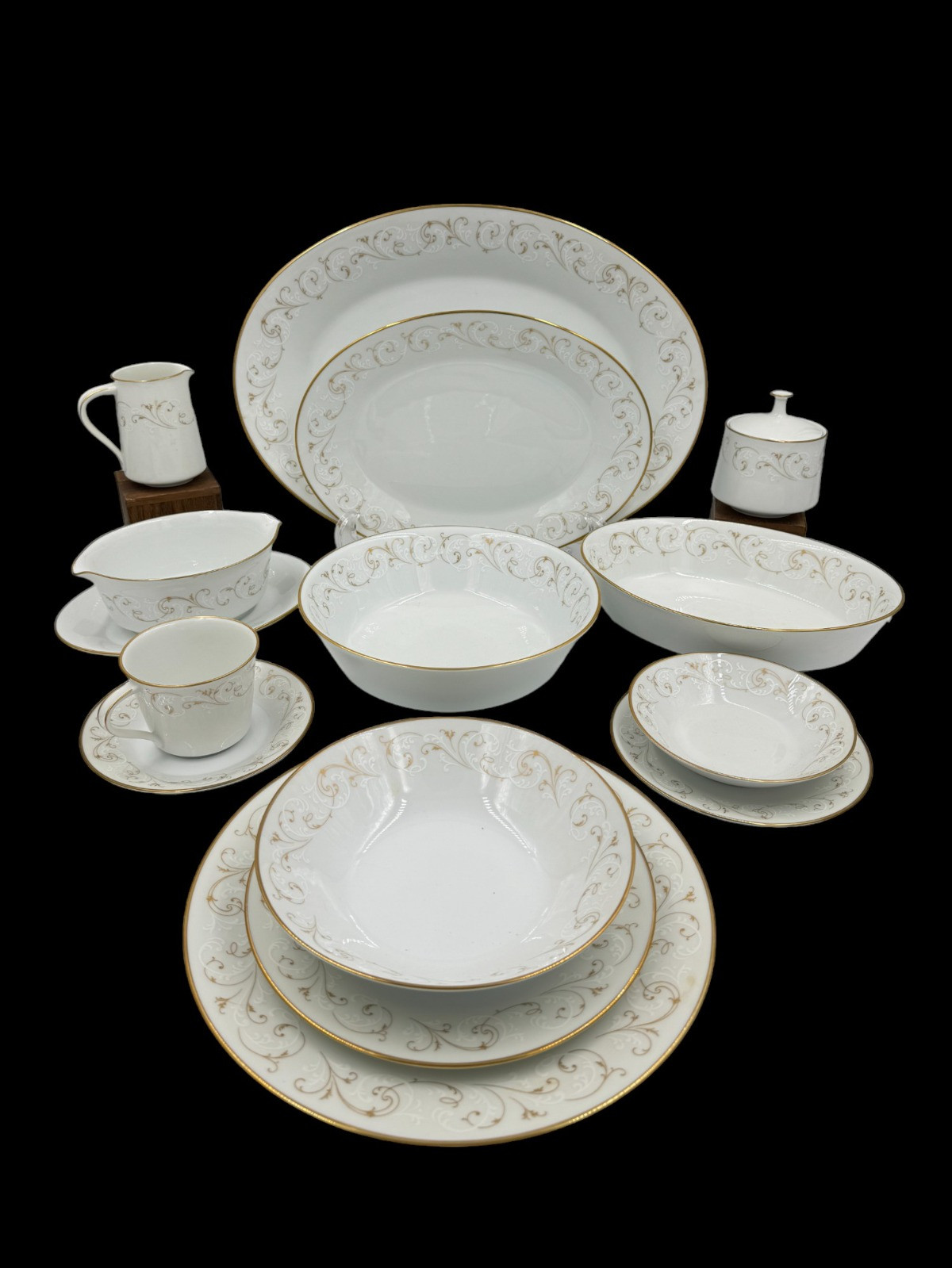 This a 7 piece table set w/ 11 complete settings (14) Saucers (12) Cups (12) 5.5” bowls (11) 10.5” plates (12) 7 3/8” bowl (11) 6.75” plate (12) 8.25” plate 12” & 16” oval platters 8.75” bowl 9.5”L oval bowl Creamer & Lidded Sugar Bowl