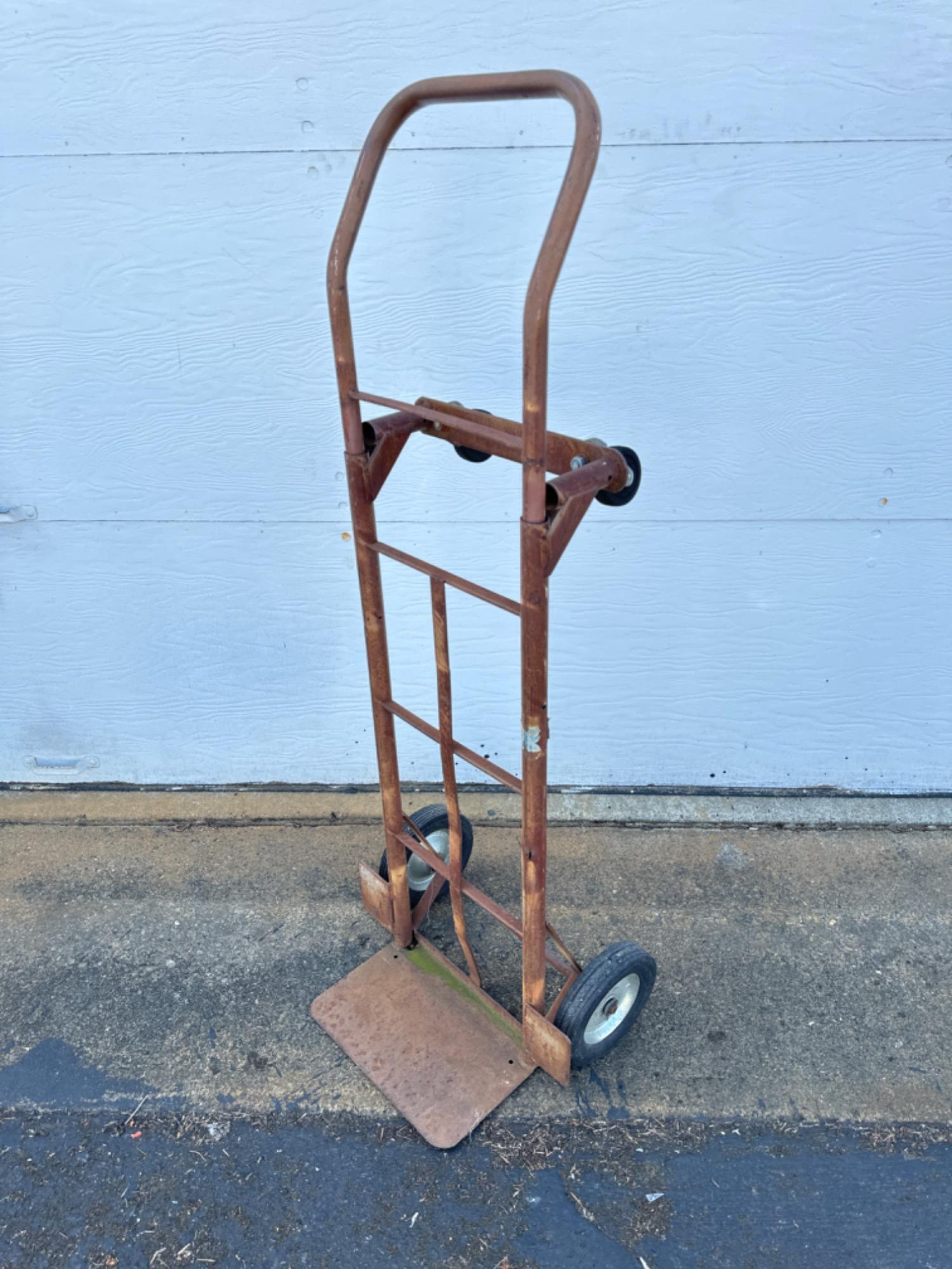 Heavy Duty Hand Truck w/Flatbed Function Has hard rubber wheels. Rolls great Unable to pull out truck handle to convert to flatbed cart - rusted inside and needs some aggressive persuasion to separate Currently stands at 52.5”T