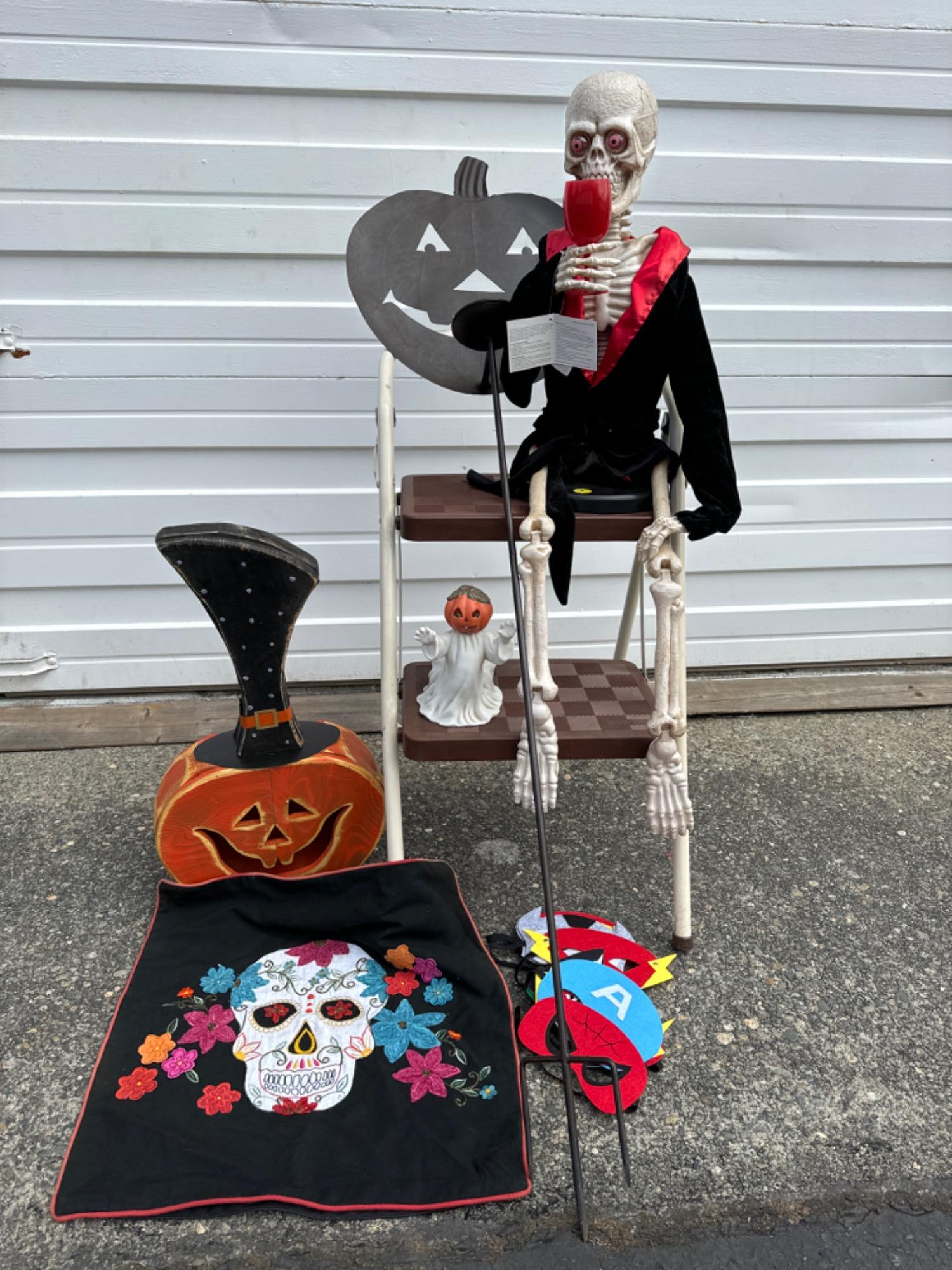 Halloween Decor Metal Halloween yard decor 58"T Wooden pumpkin approximately 25"T Animatronic talks Also includes Day of Dead pillowcase cover, ceramic ghost, and superhero masks