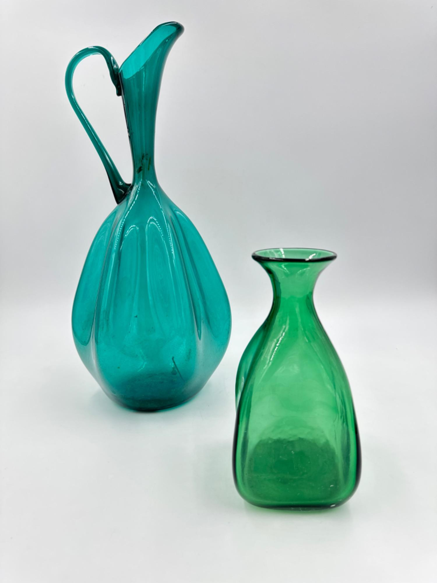 Lot # 141 - Mid Century Blown Glass Blue Ewer & Green Bottle Vase