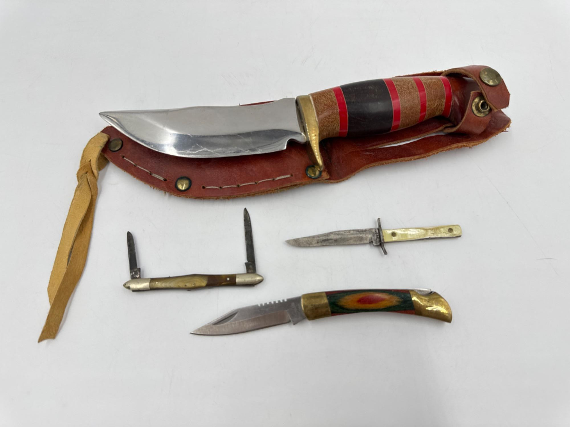 Vintage Pocket & Hunting Knives Largest 9.25" with leather sheath Smalls measure 3-4”