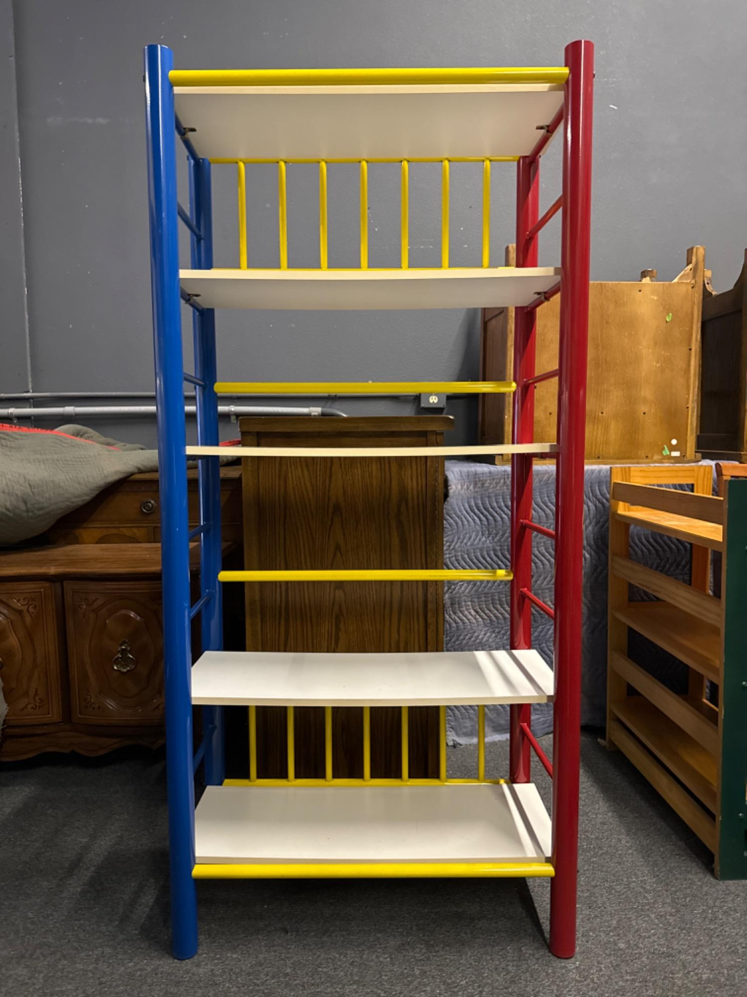 Primary Colors Child's Room 4 Tier Metal Shelf The second shelf from the bottom is bowed 32”W x 16” D x 68”T