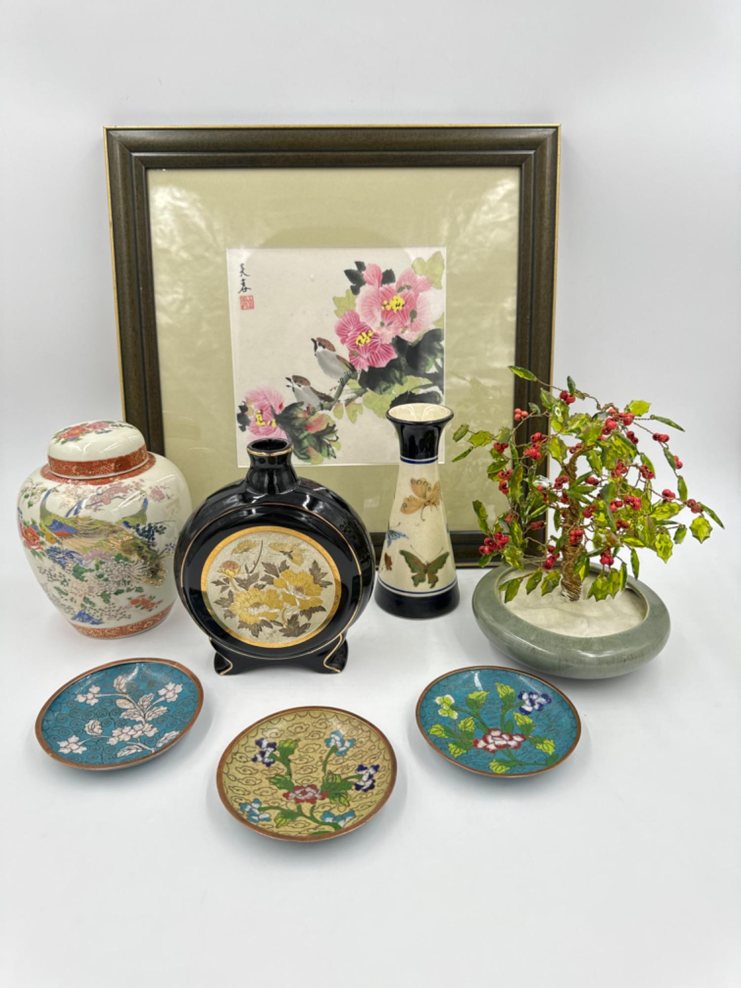 Birds & Flower Art - Frame measures 13.75" x 13.75" Satsuma Ginger jar proximately 6.25"T Chokin Vase - small flea bite to gold on lip 6.25"T and more