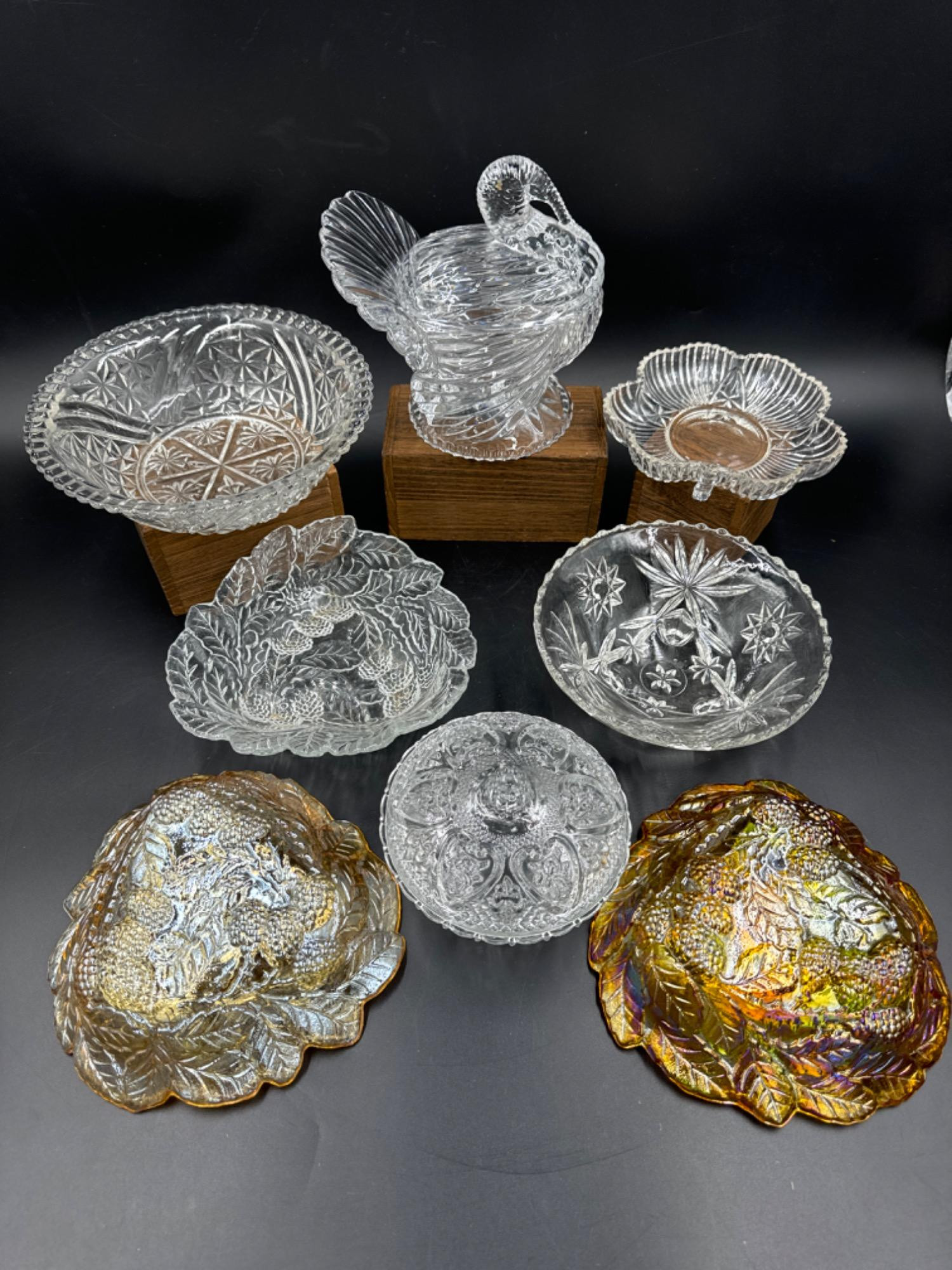 Shannon Crystal turkey 7"T x 7"L x 6"W 1970s KIG Malaysia LAFLEUR HEART Embossed Glass Candy Dish w/ Lid Anchor Hocking Star & Fan Cut Glass Footed Candy Dish (3) Indiana Glass Loganberry and Leaf dishes in 3 colors