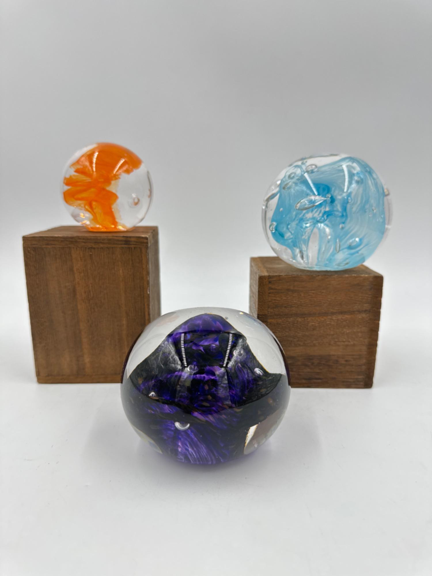 Trio of Blown Glass Paperweights - Purple, Blue, & Orange Measures: 2.5-3.5”W