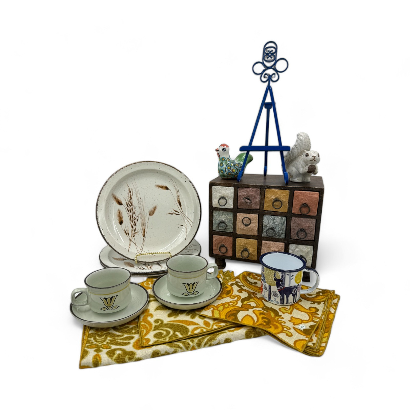 Spice Cabinet 9.75"W x 6"D x 9"T (3) Vintage Midwinter Stonehenge Wild Oats - one with wear Denby Kimberly Coffee cups with saucers - one of the coffee cups has a chip on the rim and more