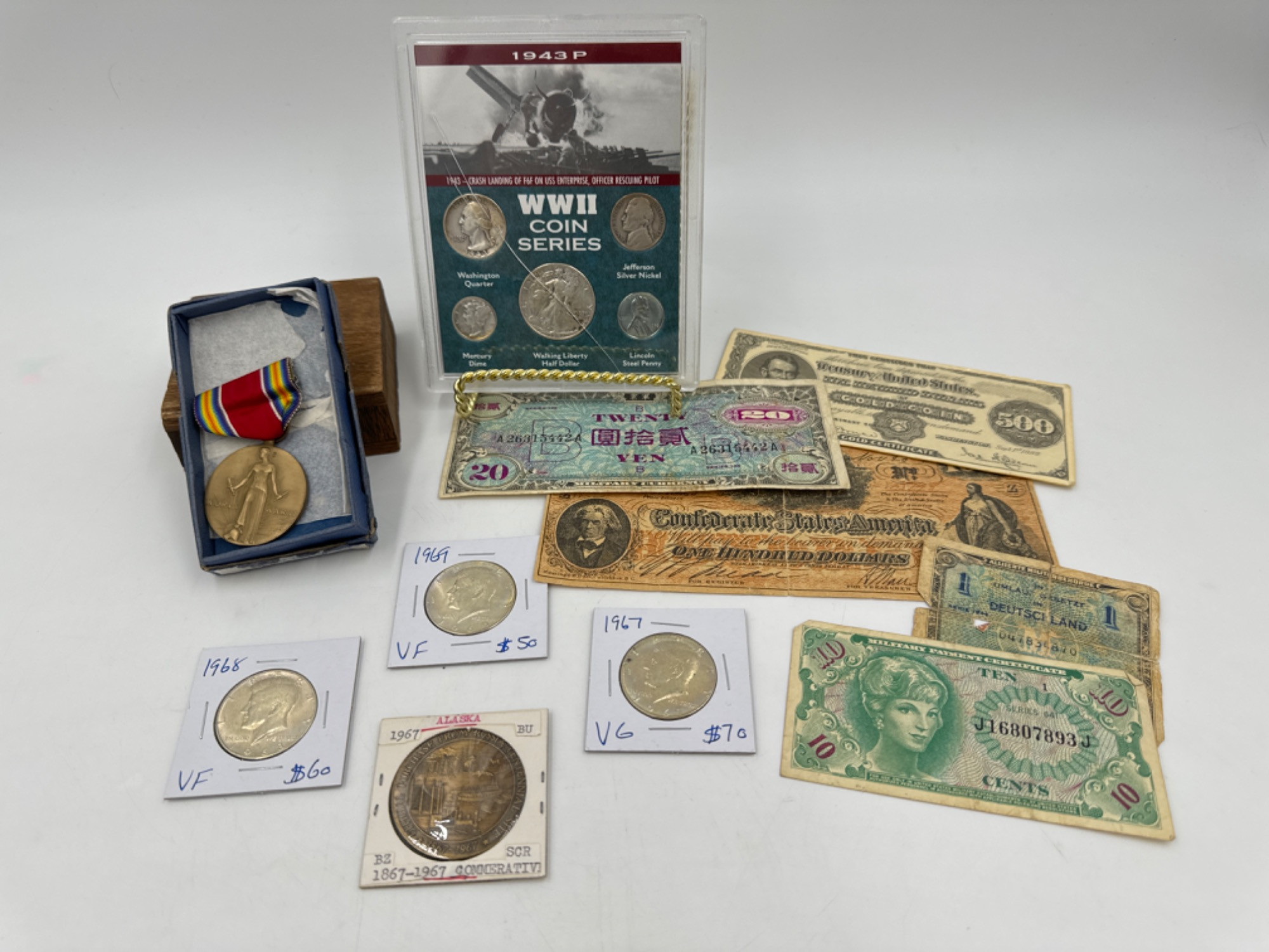 1943 P WWII Coin Series 5 Circulated Coins in Plastic Holder - cracked holder Cannot verify authenticity of Confederate Currency 67-69 Half Dollar Kennedy Coins and more
