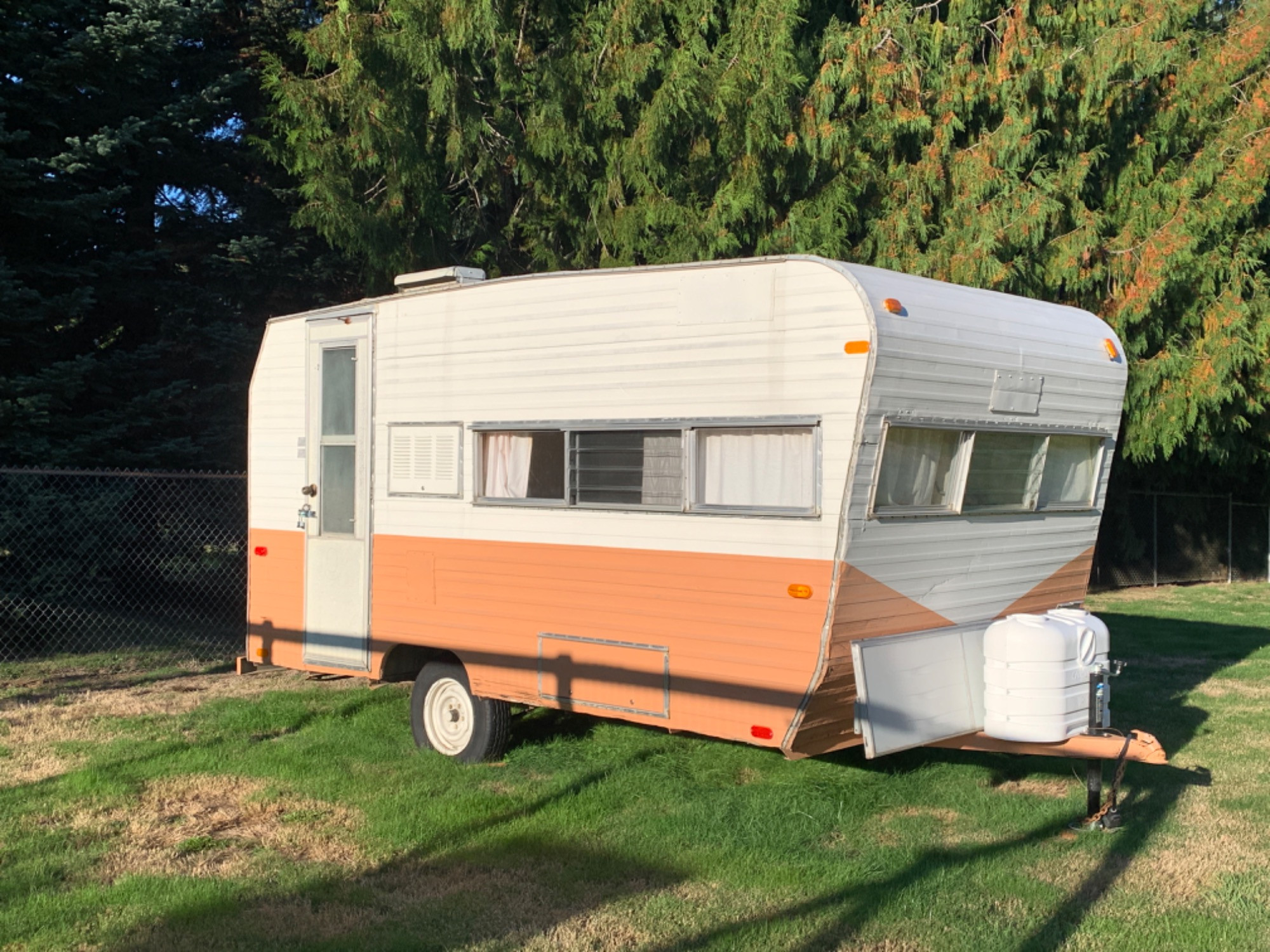 This refurbished vintage trailer is perfect for those little getaways, campsites or backyard living spaces. Specifics: updated 1969 kit companion travel trailer *3,000lb fully loaded, *13ft long, *brand new jack, *new fridge, new heater-never used *Full XL bed with storage, *propane stove, *portable composting toilet-Never used, *weatherproof cover *Tires replaced in 2020 with minimal miles *Interior refreshed with new paint, backsplash and flooring. Newer memory foam mattress is clean. *original avocado green propane stove
