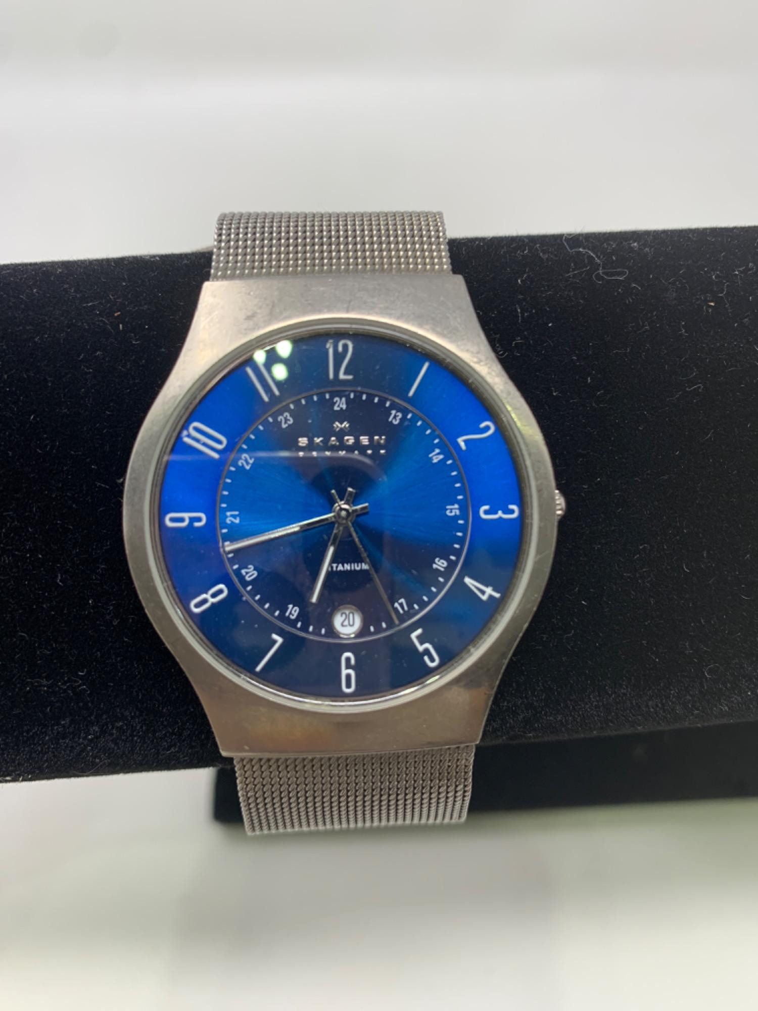 Skagen omega wristwatch is still keeping time. Albeit needs a gentle cleaning. Blue face with flex steel band. Date gauge. Titanium face Serial number is 233XLTYN. Made in Denmark.