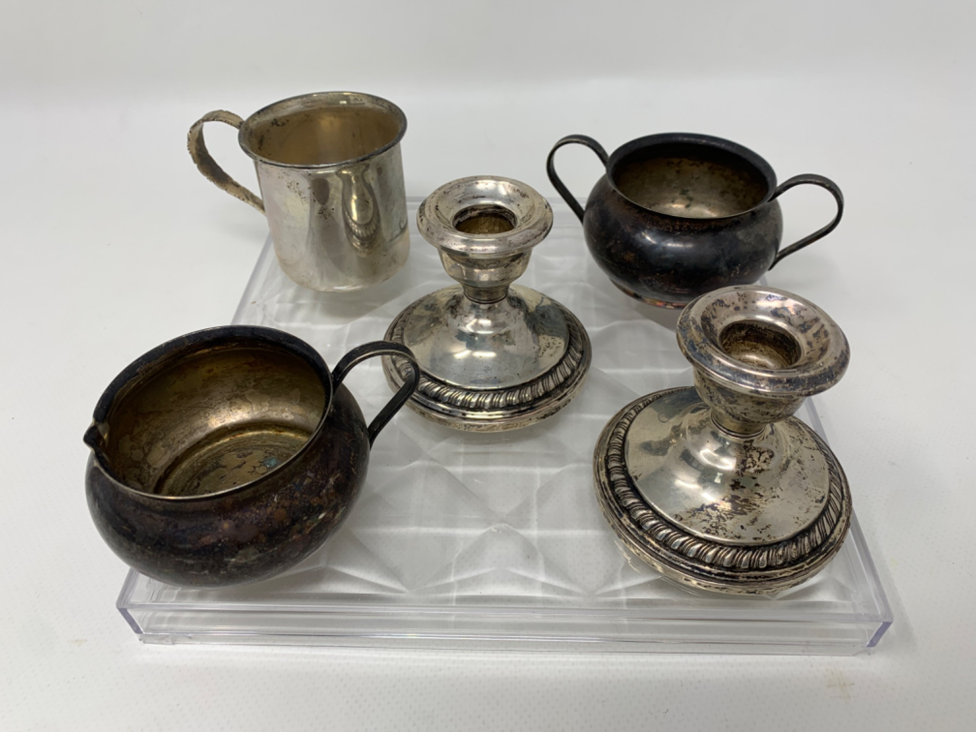 Lot # 7 - Sterling Silver Candlesticks and Cup, Vintage Metal Creamer and Sugar