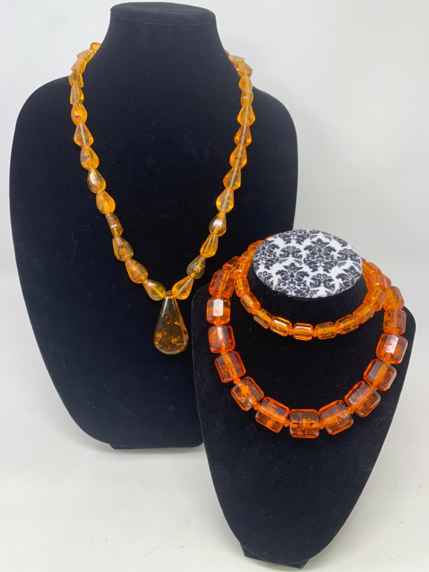 Large, pressed Amber beads. With inclusions and smaller gap beads. In good condition. Graduated sizes. Length is 15 and 13 inches long. Dark orange color. Other is golden amber with tear drop pendant. Inclusions present.