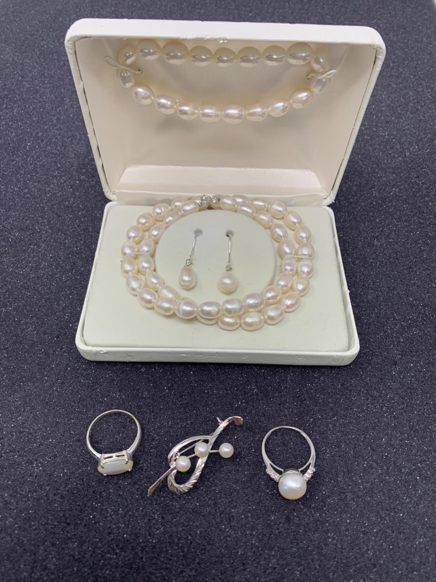 NIB pearl necklace, bracelet, earring set. Sterling silver clasps and mounts. Vintage pearl and sterling silver pin. Two pearl and Mother of Pearl rings with sterling silver bands. One with diamond style setting. Ring sizes are 7.5 and 8.5. 3 pieces weigh 9grams.