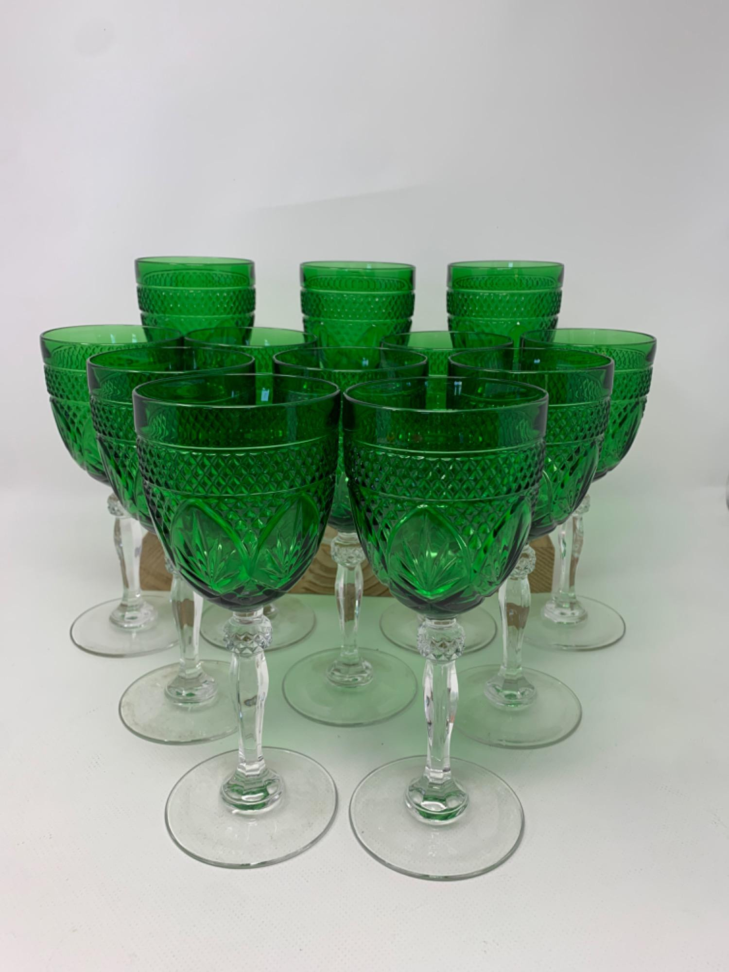 Luminarc pressed green glass goblets with clear glass stems. New in box-12 each. Heavy glass quality. Vibrant color.