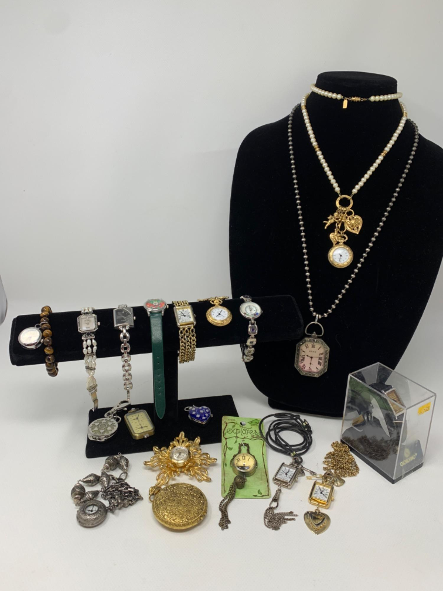 Watches, necklaces, pins with time pieces. Swatch-It gold chain watch, quartz, Lecoral, Peyote bird brands and more. Silver watch in case with .999 silver face plate. Tenth ounce fine silver.