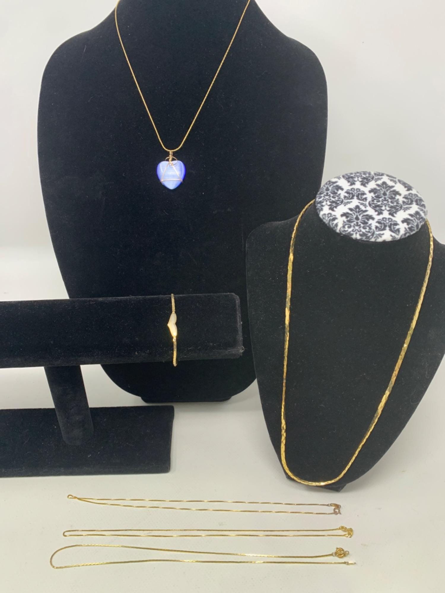 Five necklaces. Two are 23k gold over sterling silver. One necklace has a broken clasp. Small gold bracelet. Blue heart pendant with gold chain. Largest chain is 23in long. Two sterling silver and 23K gold necklaces are 4g weight.