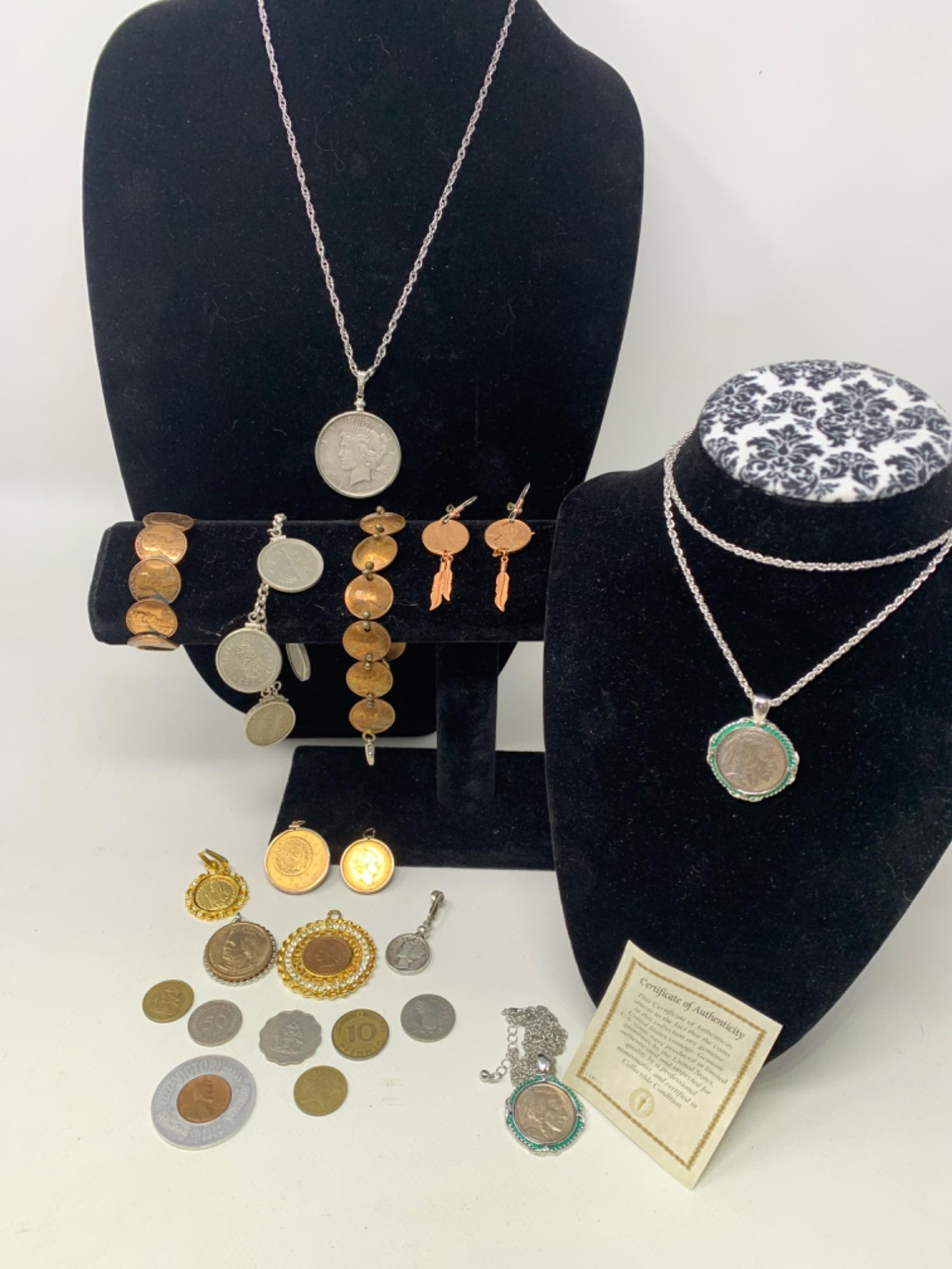 Foreign currency from Germany and the Bahamas. Jewelry is American and Italian. Two necklaces with certificate of authenticity for Buffalo head nickel. Earrings, bracelets, necklaces.