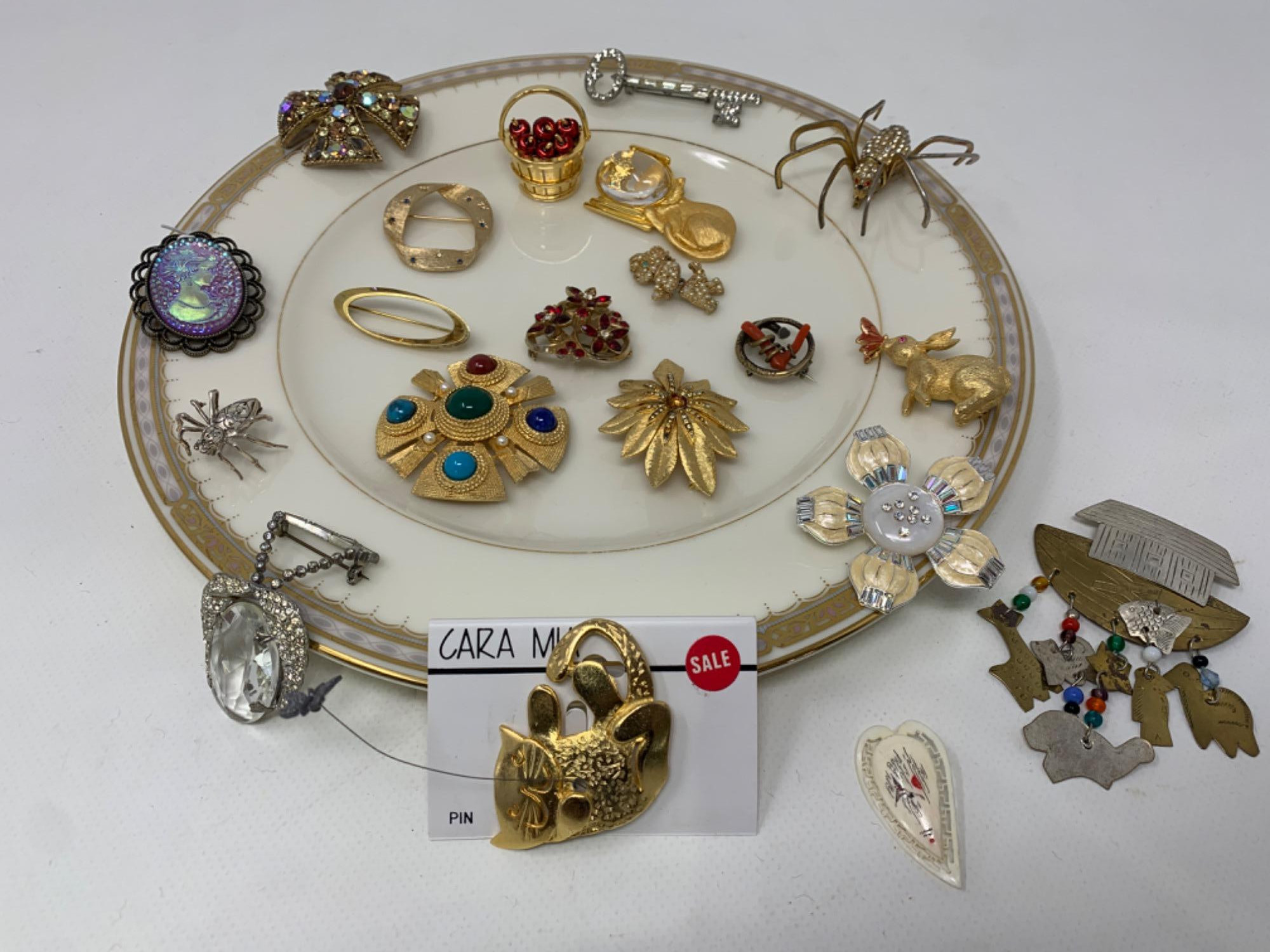 Beautiful collection of vintage brooches and pins. Most are gold toned. Some are new. Most are in great condition. Some are signed. Lovers knot with real coral in it. Gold and gemstone dog is jointed.