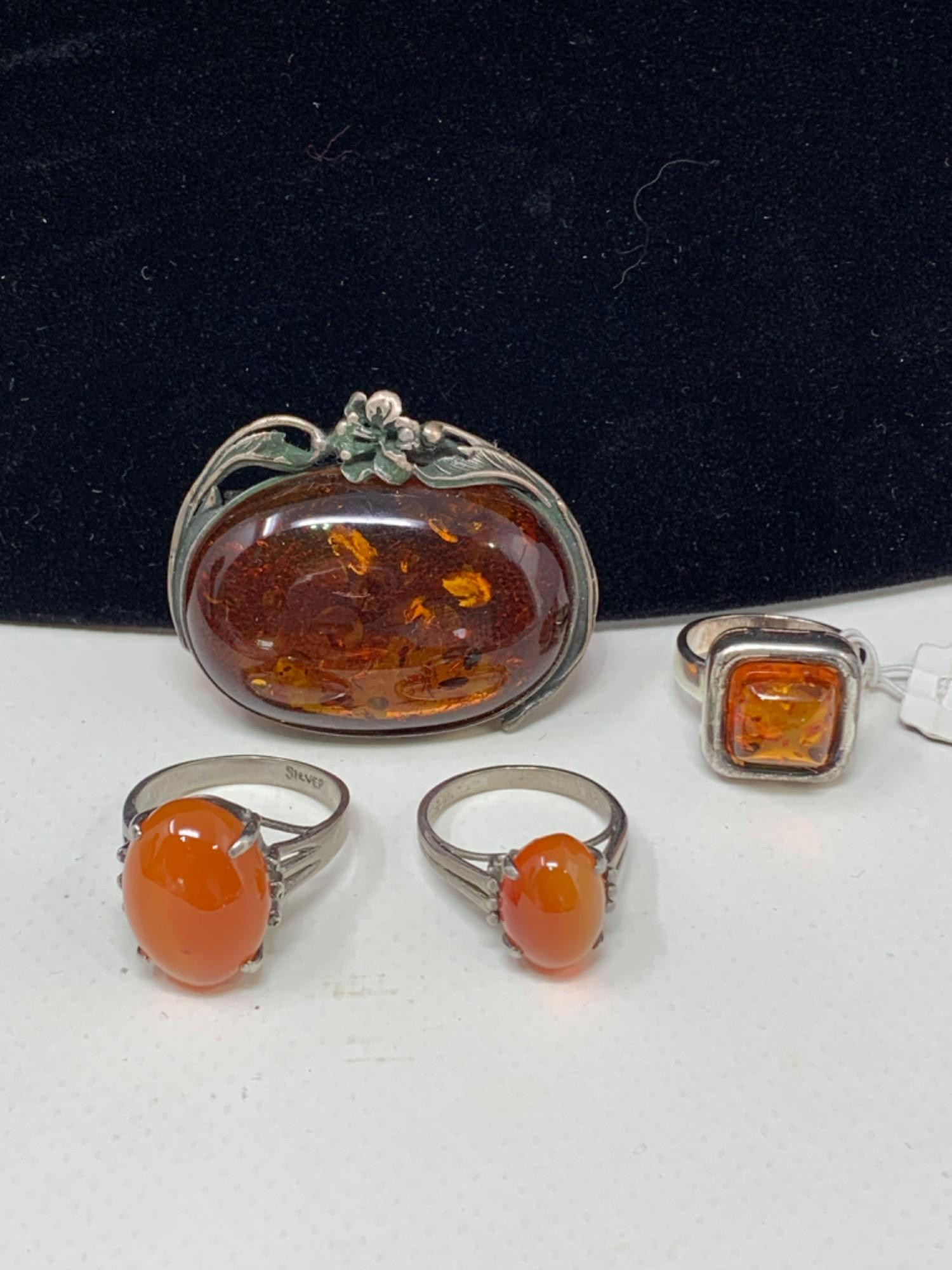 3 amber rings with silver bands. Brooch with silver mount. Weight is 17grams. Quality vintage jewelry.