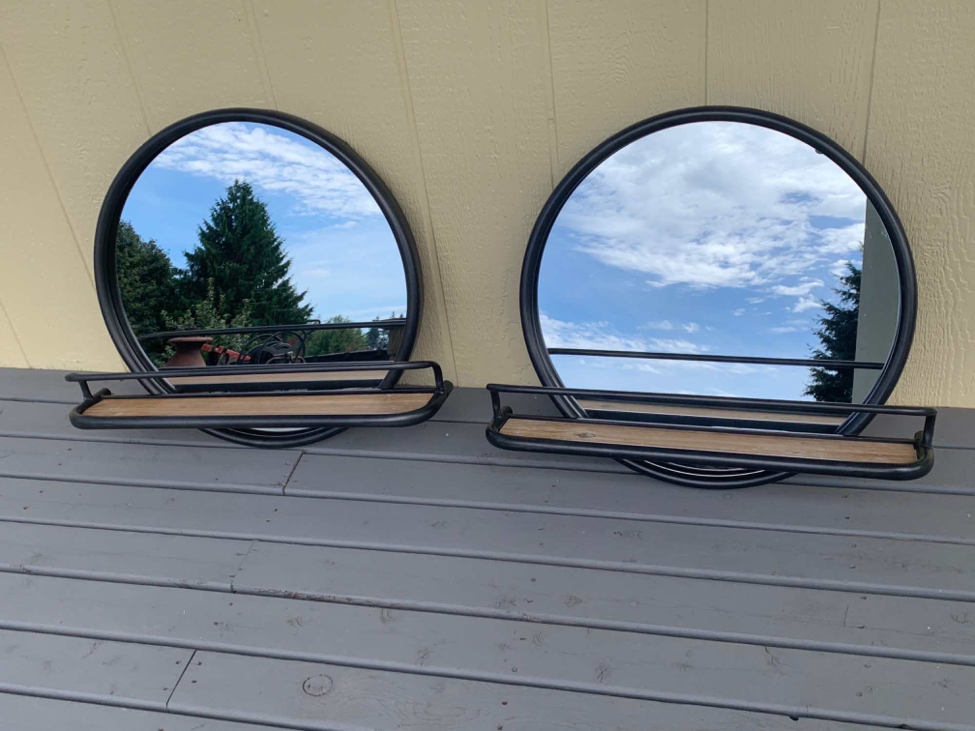 Round metal mirrors. Wood shelf. Two mounting brackets attached to each. Heavy mirrors.
