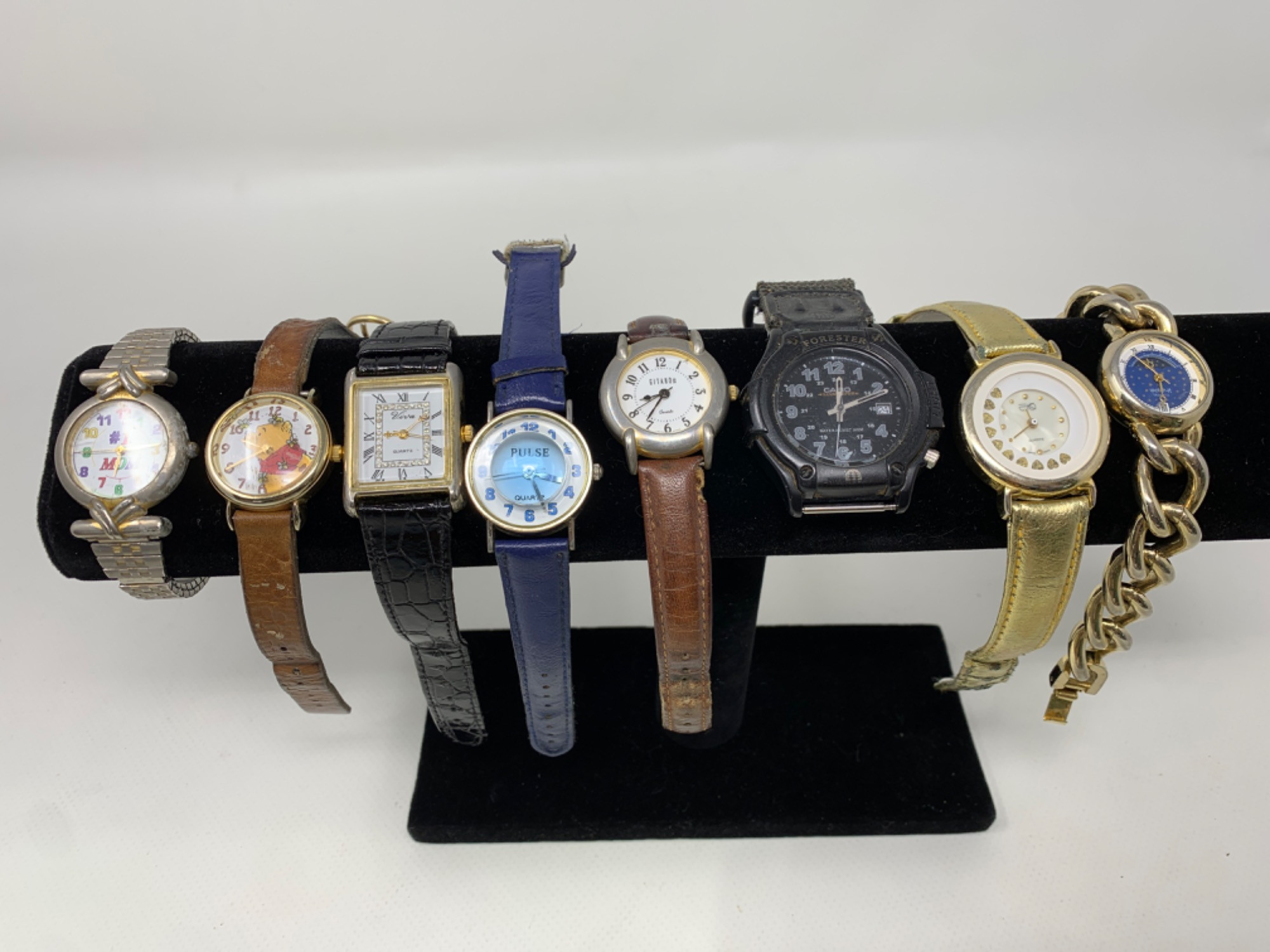 8 watches. Most with leather bands. One chain and one metal band. May need batteries or wound up. Gitano, Pulse, Viva, Watch it and more.