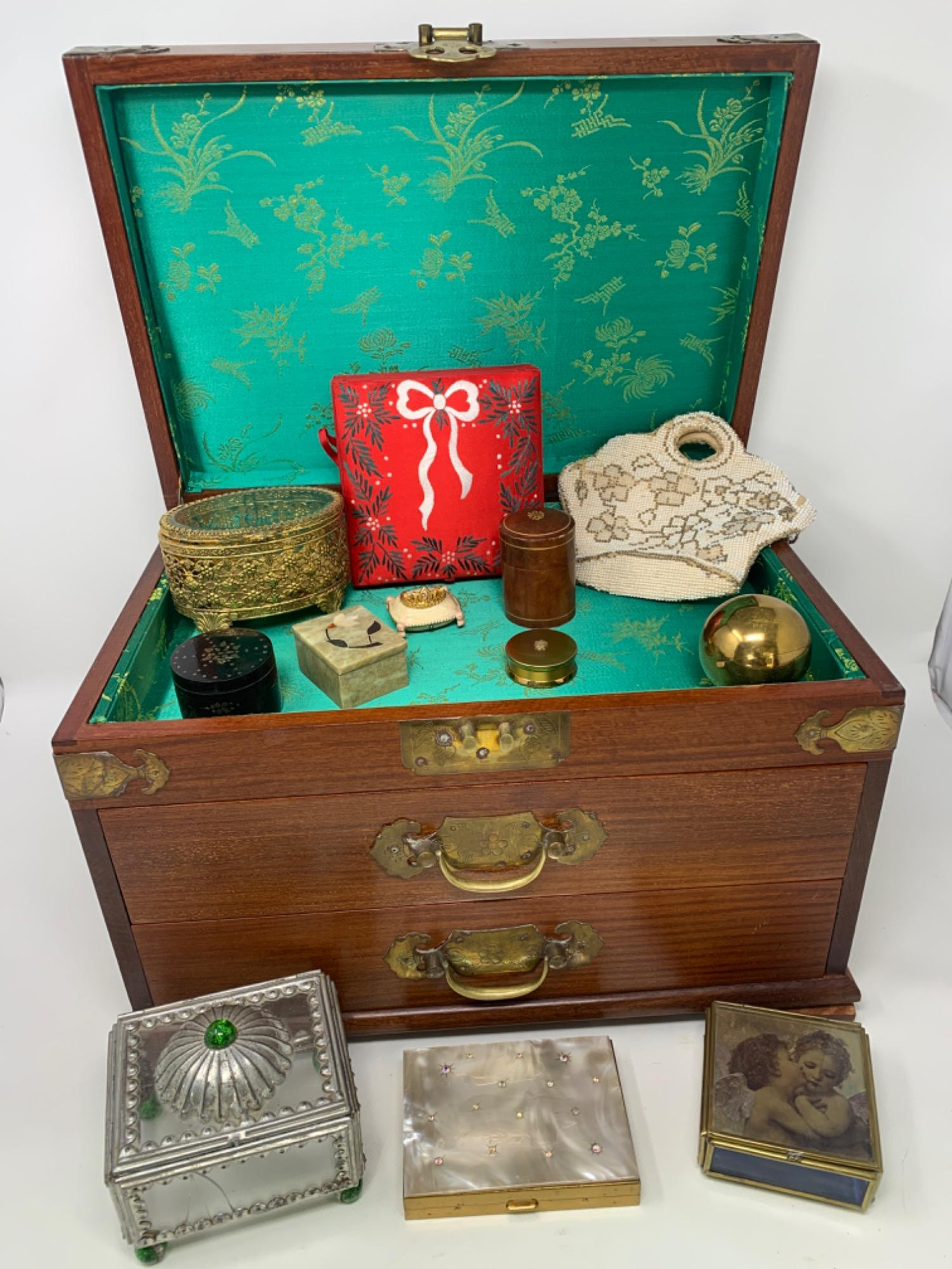 Monet Limoge style box, Henrietta Brass ball compact. Soapstone inlaid box, leather box, black wood detailed box. Brass ring box. Brass and glass footed box. Silver and glass box has a crack. See pics for details. Wood chest has a loose foot and brass details. Two drawers and top compartment.