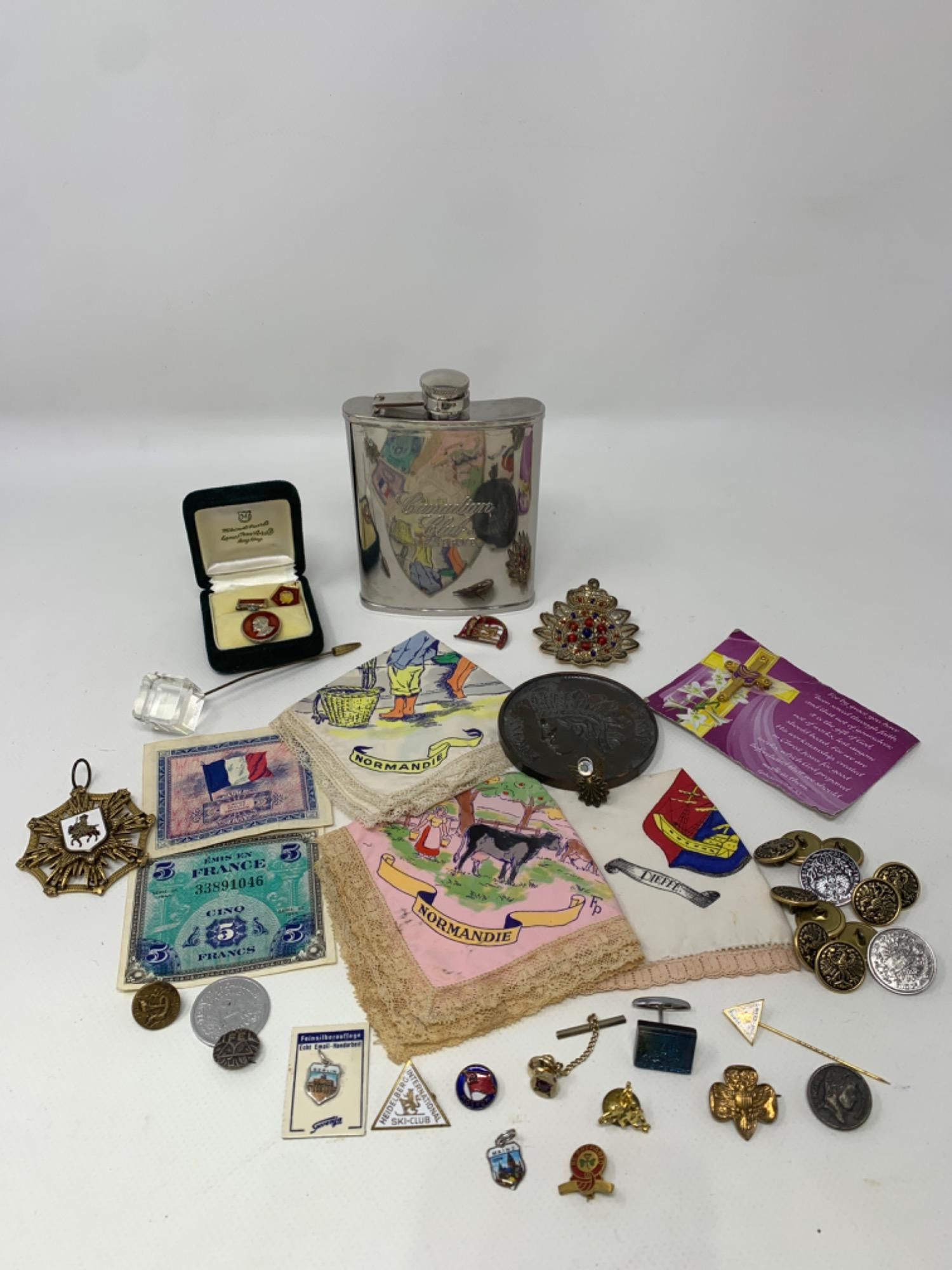 Vintage handkerchiefs from Normandy. French currency, buttons, organizational pins. One new steel flask. Vintage Lenin pin collection. Mate to cufflink found.