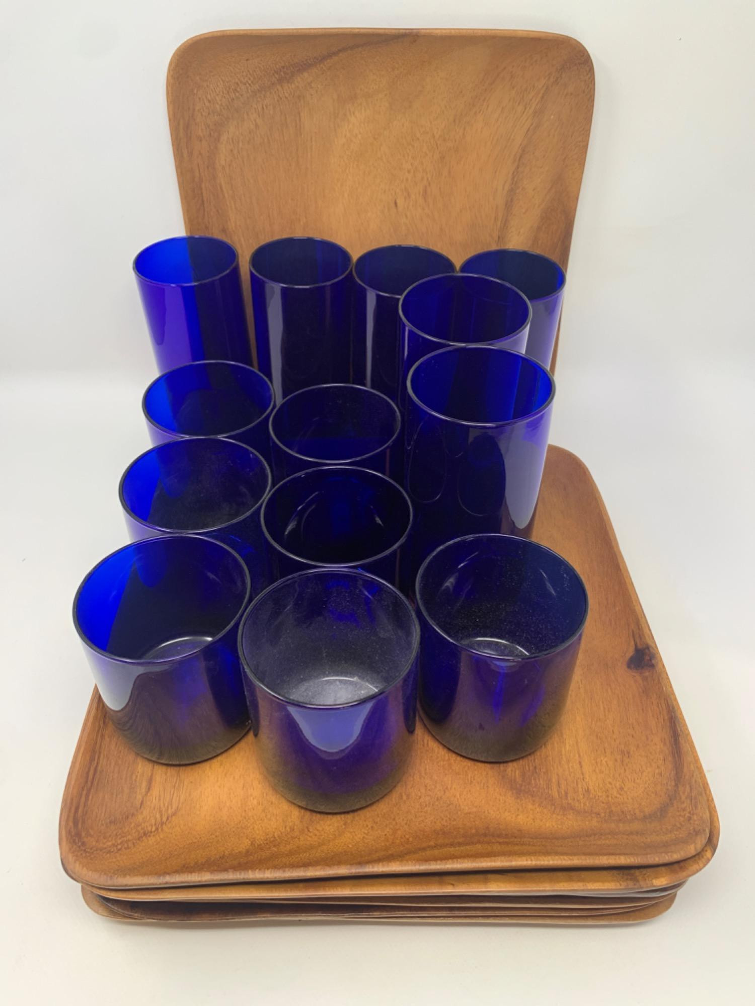 Lot # 117 - MC Wood Trays, Hand Blown Blue Glasses