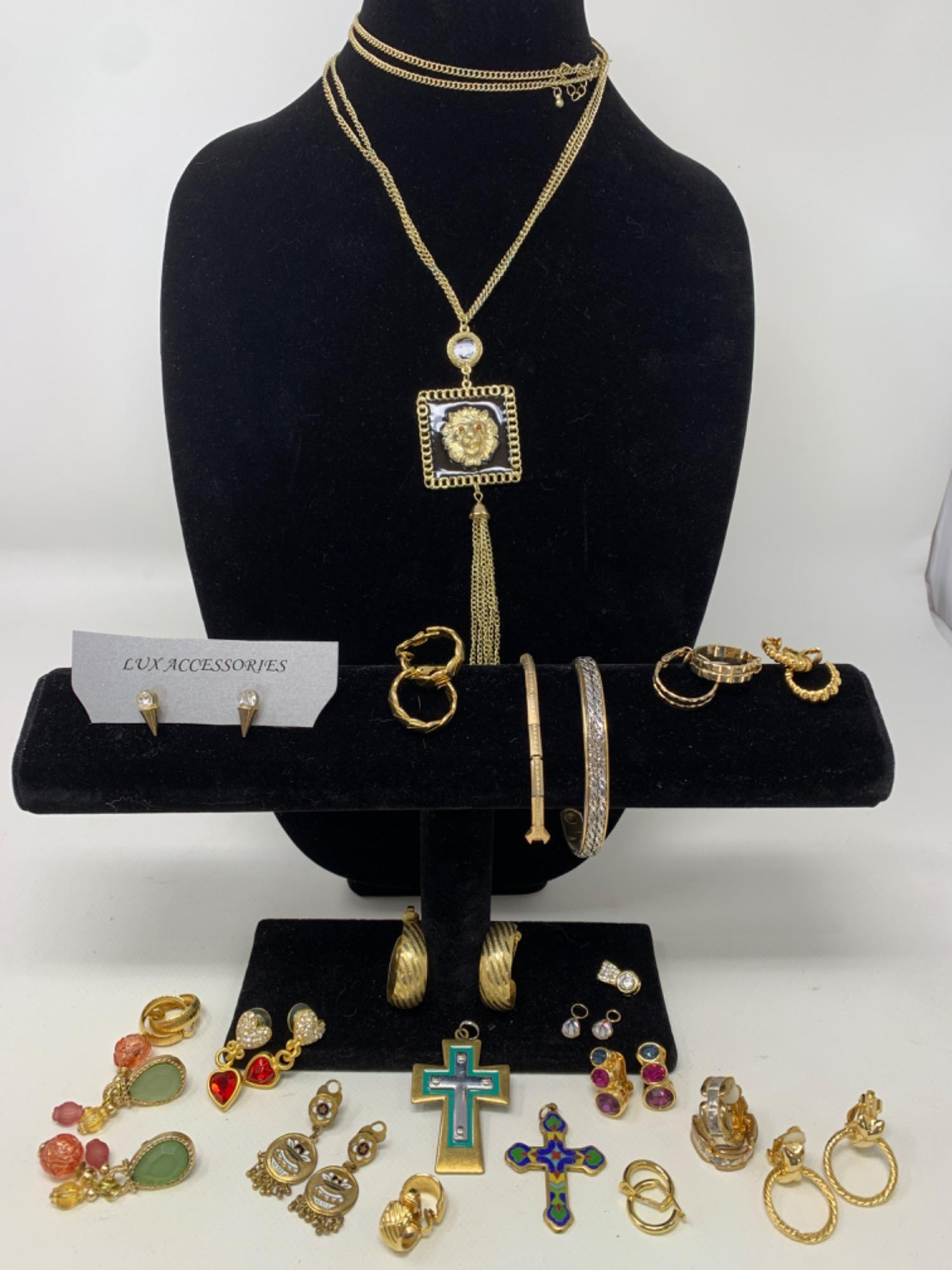 14 pairs clip on earrings. Two Crucifix pendants. Two gold and silver toned bracelets. One lion necklace. Very long chain. Gold and diamond loose pendants. Leslie Block signed. Others signed. Another set of earrings and pendant added.