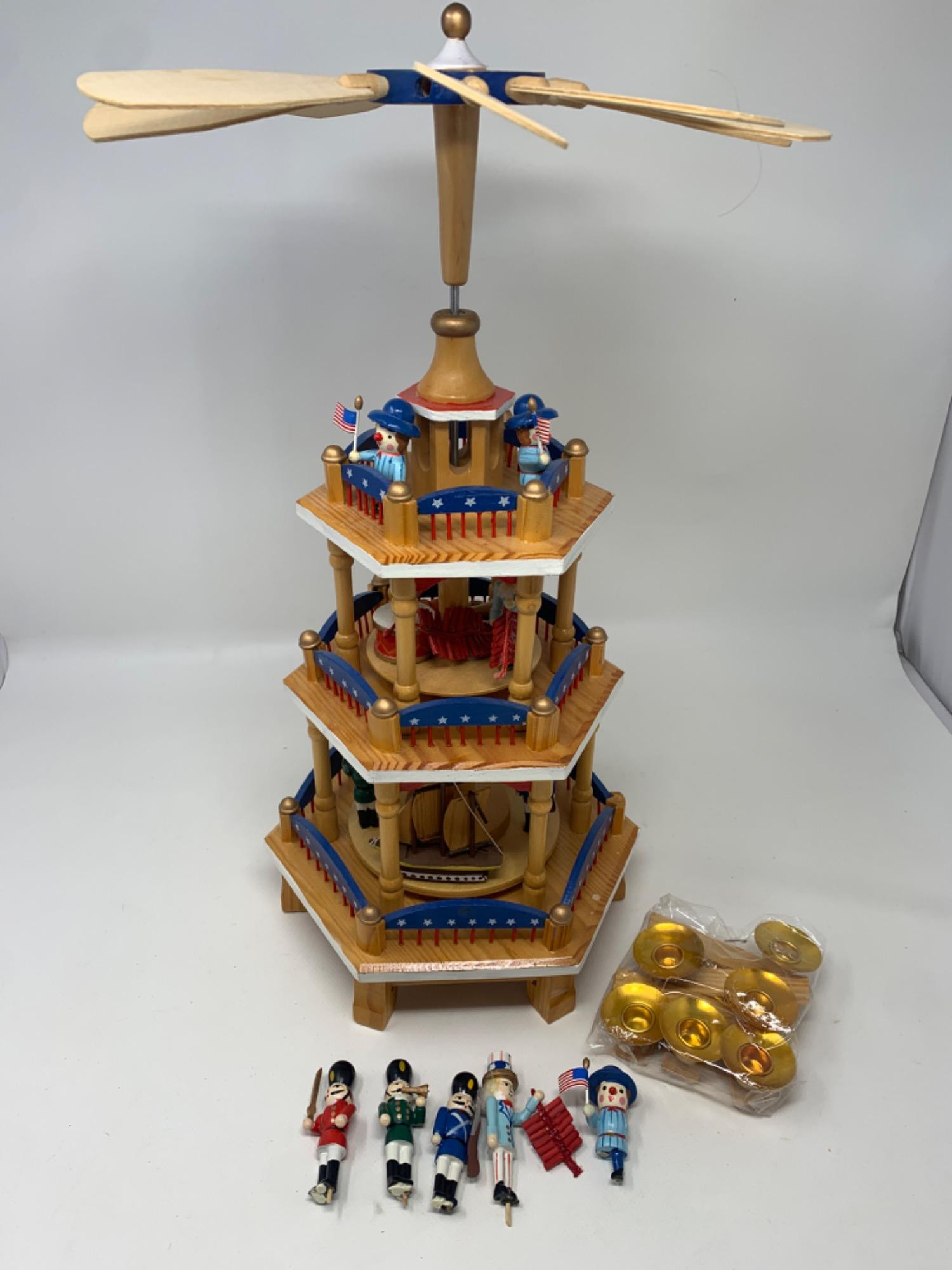 Vintage Erzgiberg pyramid candle tower. 11 Paddles, one is missing. Extra soldiers and Uncle Sam figures. Candleholders still in bag. Two railing pieces need reattached. Charming display.