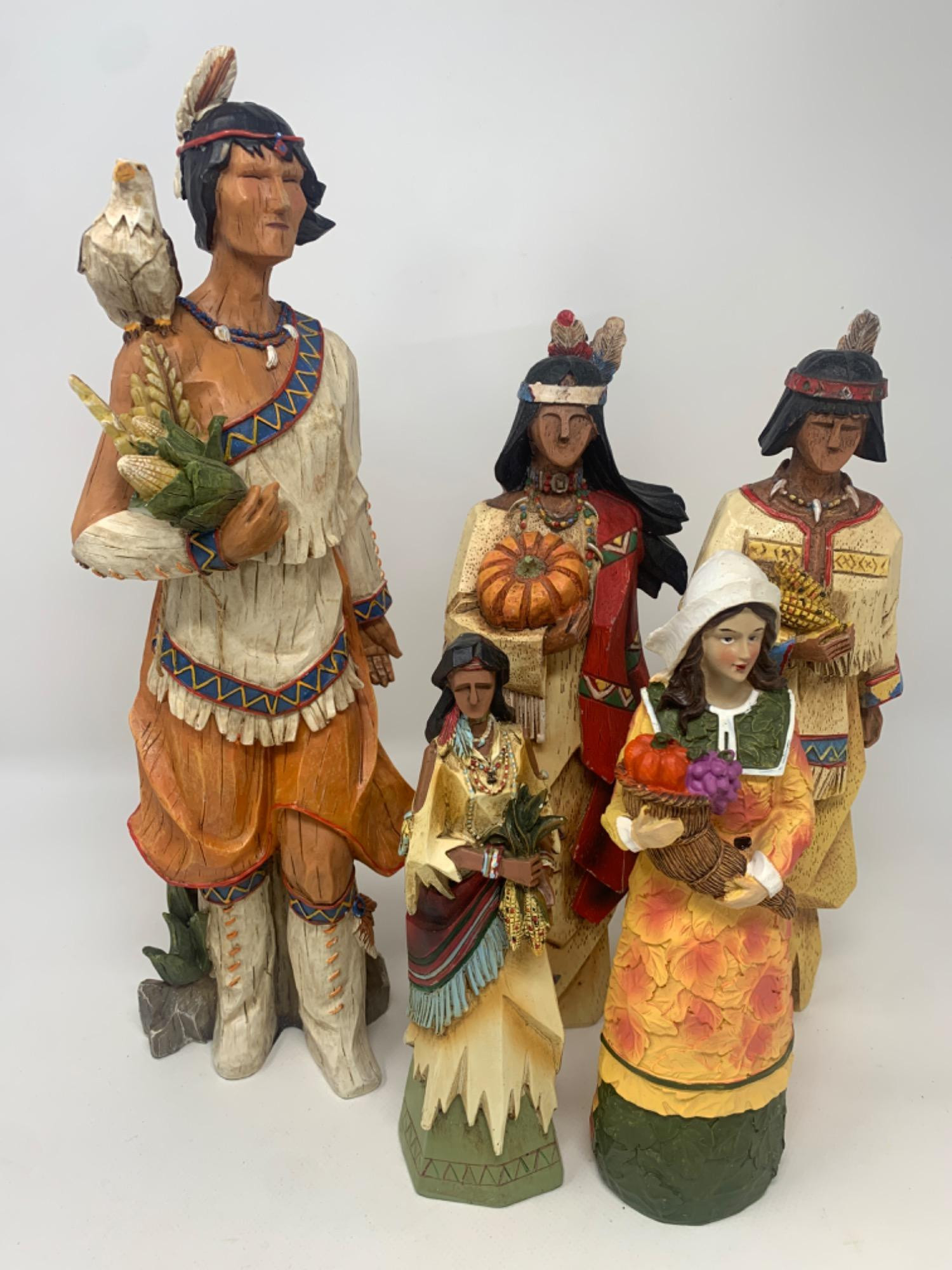 Five figurines. Carved resin and painted. Lots of detail and color. Sizes range from 8.5 inches tall to 16 inches tall. One is a female pilgrim with no mate.