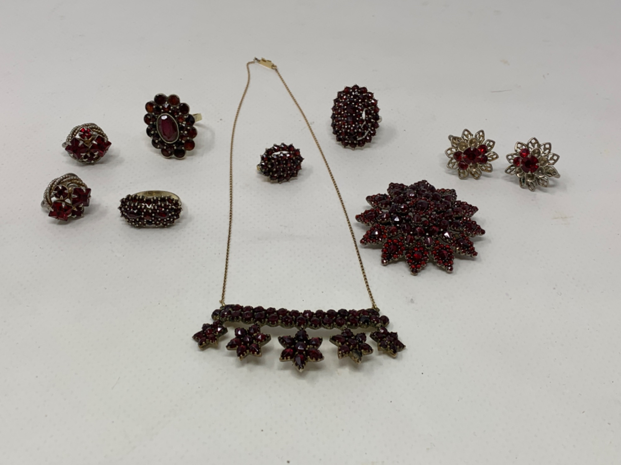 Vintage Bohemian Garnet costume jewelry. Two sets of clip-on earrings. Three rings. One brooch and one necklace. Rings are size 8 1/2 and 4. Update: Necklace has 8K gold chain and real garnets. Solo earring has real garnets. Metal setting is fake metal. Large oval garnet ring is 8K-Flower pattern Silver and Garnet brooch and oval ring all others costume
