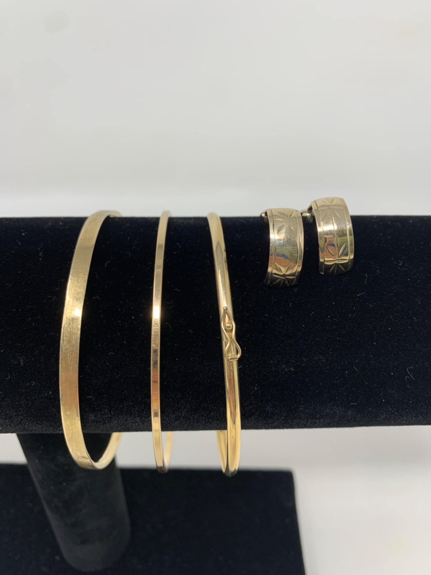 Three gold bracelets. Clip on earring set is 14k. Two bracelets are 14k. One is 10k gold. Weight is 18grams.