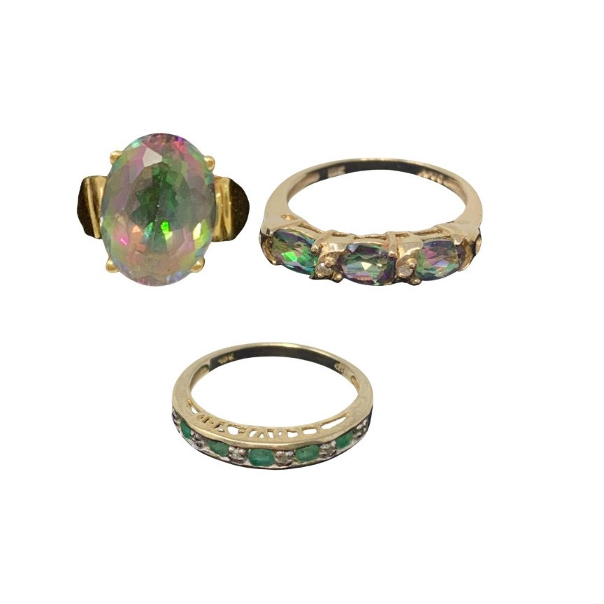 Lot # 79 - Three 10K Gold Vintage Rings with Emerald and Mystic Topaz Gemstones