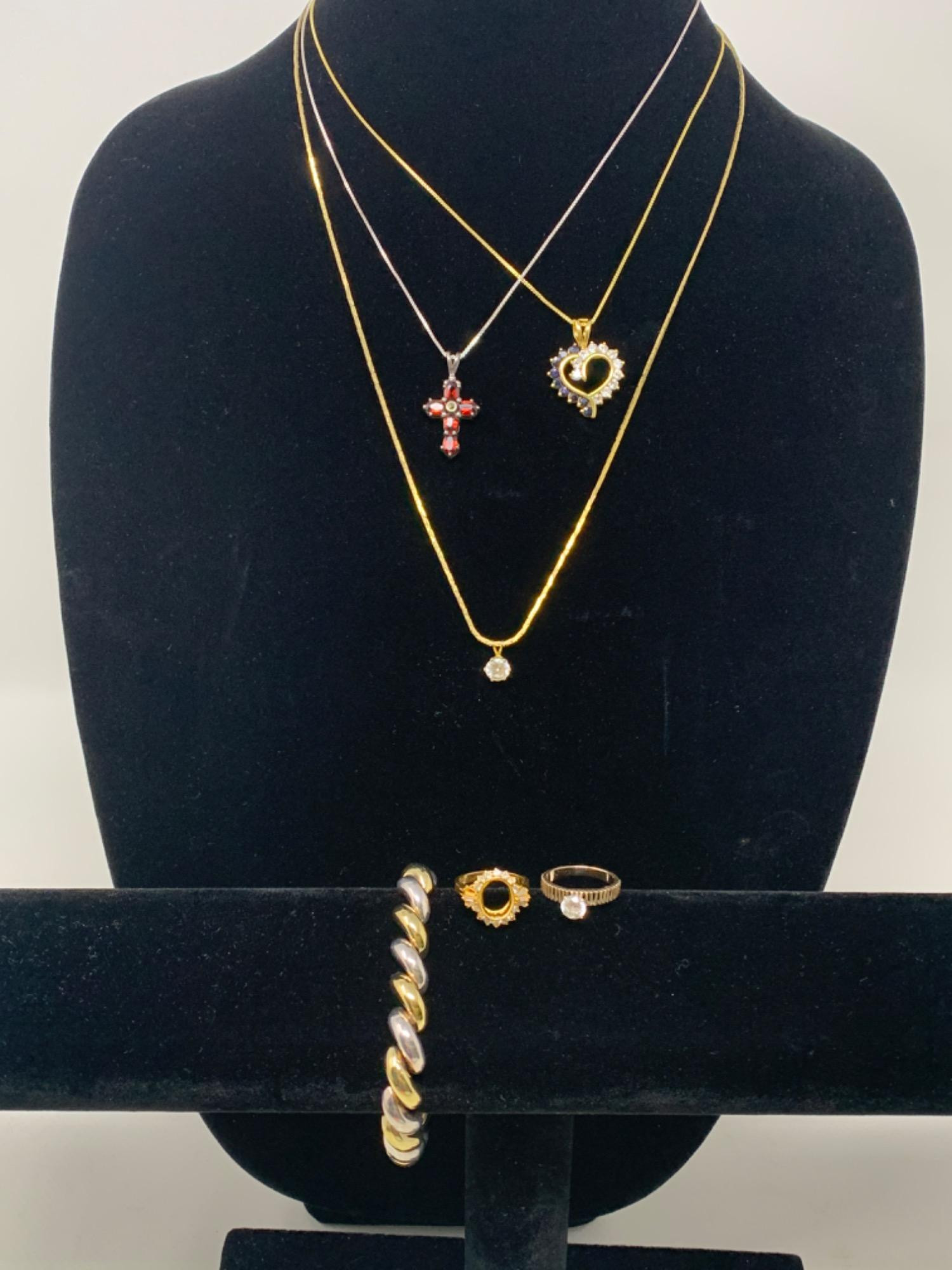 Two rings are size 6, 5.5. One sterling silver bracelet with gold and silver braided look. Three gemstone necklaces. Ruby crucifix is authentic Sterling silver. Diamond pendant is not real. Styled Diamond and sapphire pendant. Diamonds are not real. Gold ring with single diamond. Stone is not real, setting tested positive for gold. Ring missing center stone is electroplated gold. Weight is 34grams