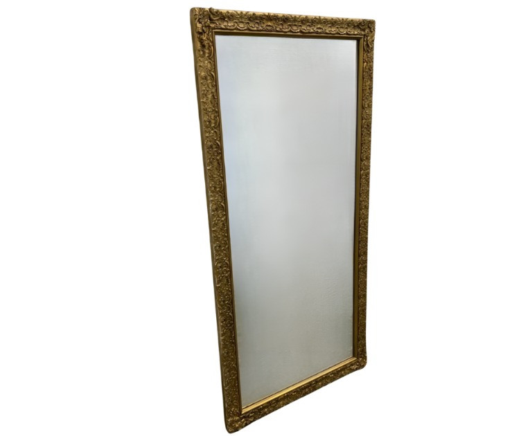 Vintage carved design framed mirror. Measures 48” tall x 24” wide. There are several chips and scrapes along frame edges. Mirror is clear and clean. Reflection performs as is expected.