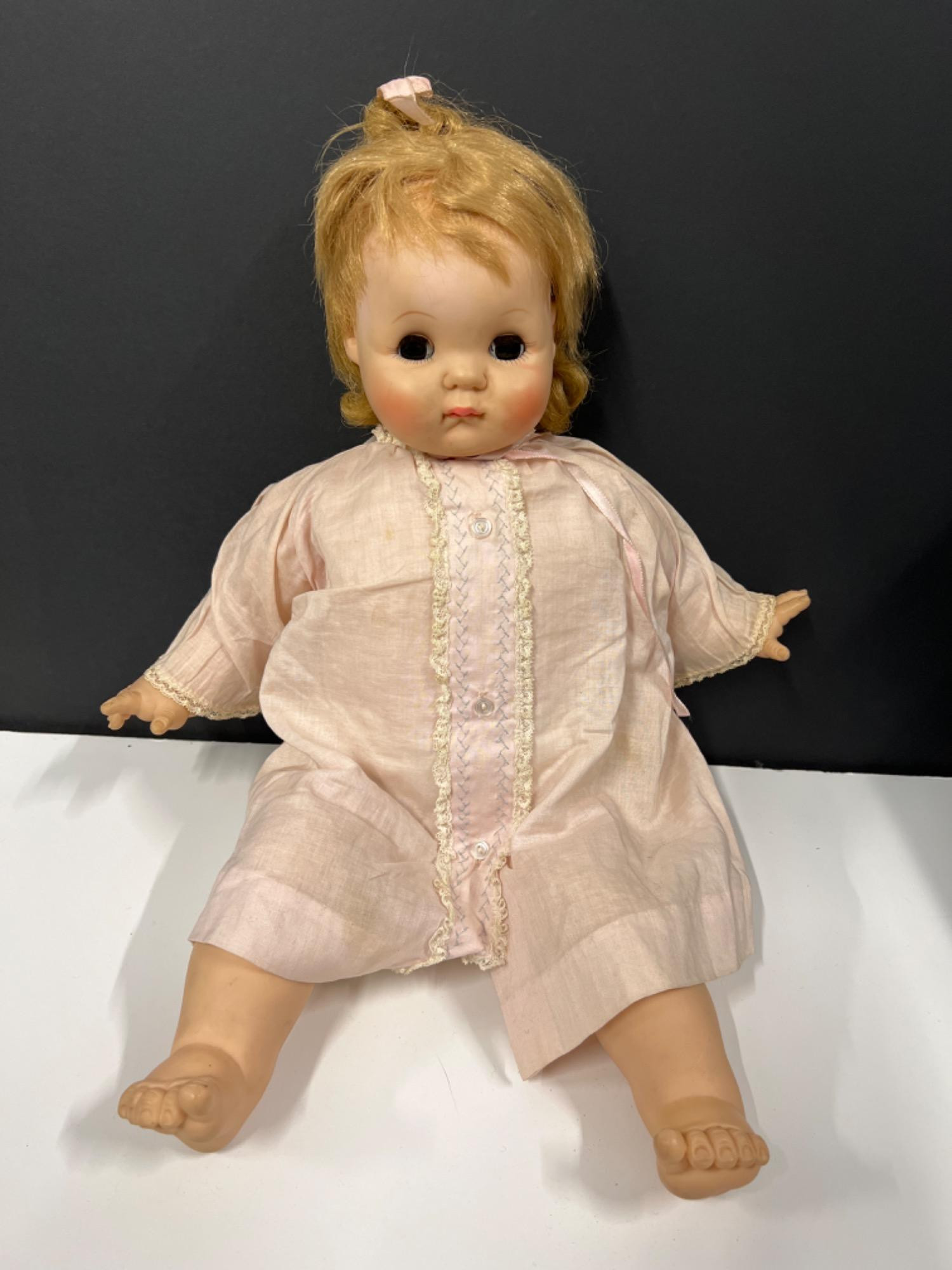 Doll is 21”. Note red paint on back of legs (may be removable). Original clothing. Face makeup is intact. Eyes close and open. Vinyl head, arms & hands, legs & feet, and cloth body. Has knit booties (uncertain if this is original to doll).
