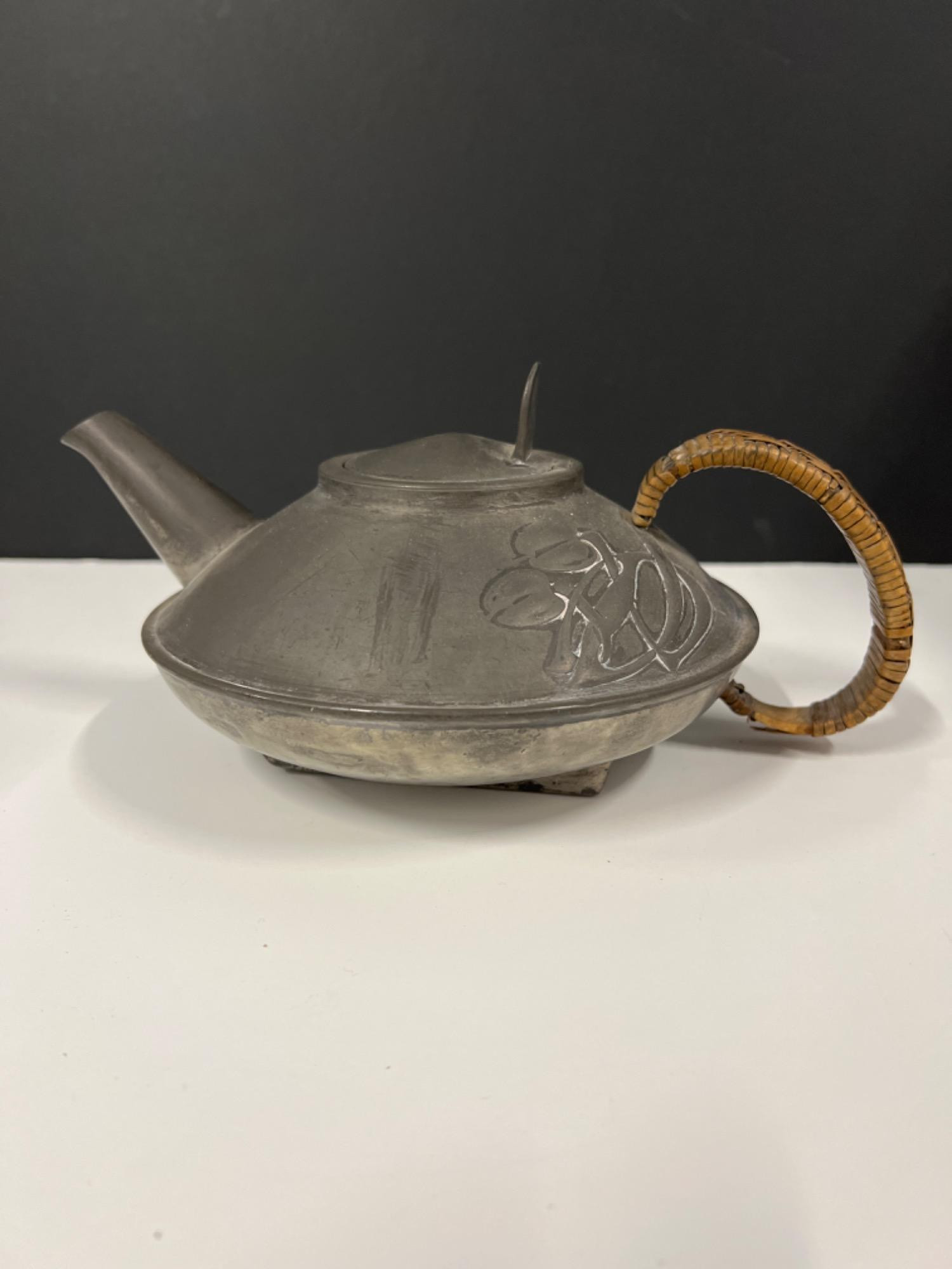 Teapot is made of English Pewter and has a wrapped handle. Size is 4" tall x 9.5" long x 4.25" wide. Note found inside of pot states that Archibald Knox is the designer of the pot, that the pot was owned by Lord Robert Baden-Powell, the founder of Boy Scouts of America, and that the teapot was a gift from an antique dealer in England, John Crowther. There is also a reference to a book called, "Art Nouveau" by Maris Amaya. The teapot is featured on page 64.