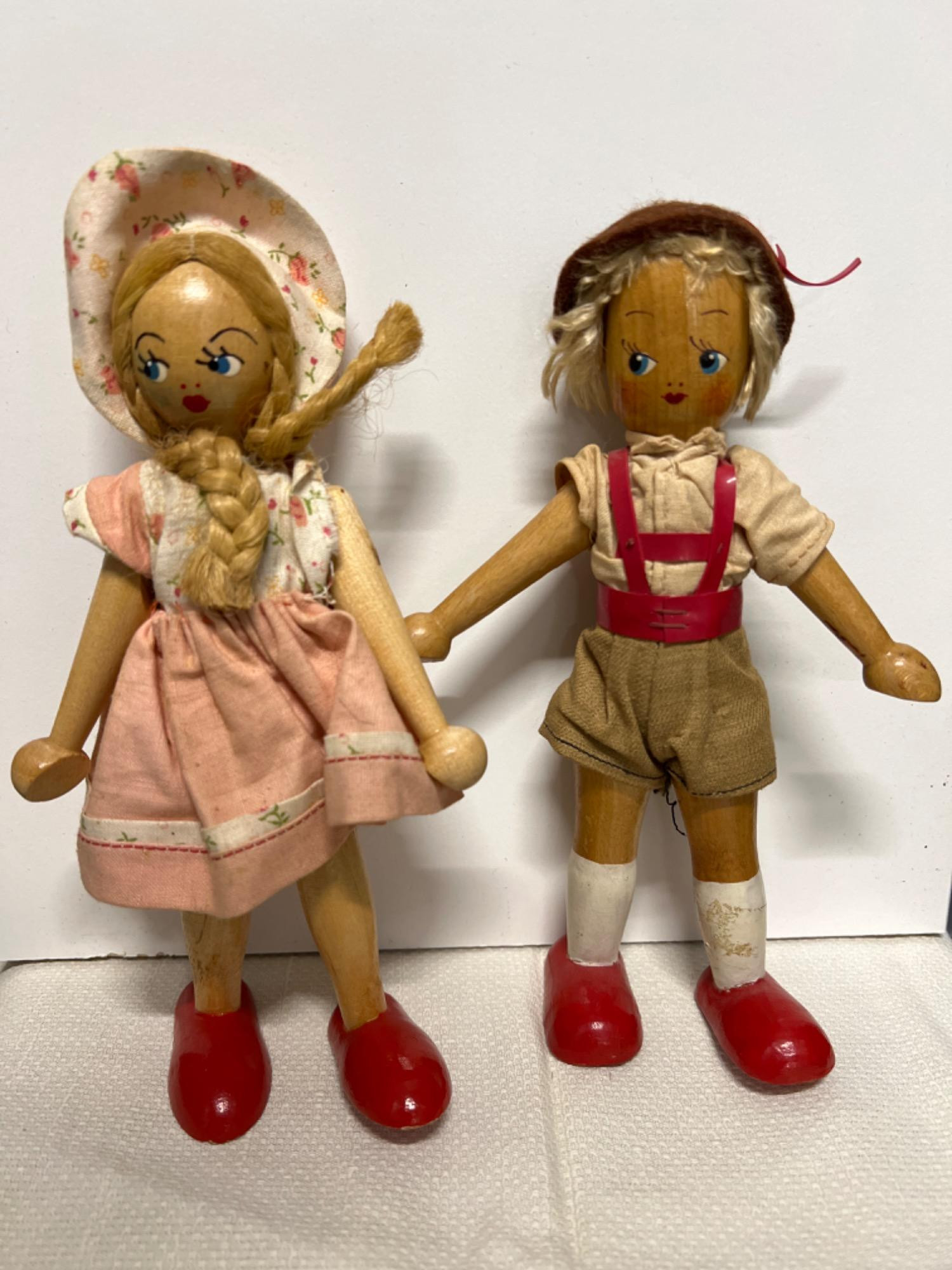 Hansel is 7” tall and Gretel is 7.25” tall. Wooden dolls thought to be made in Poland. Note arms on girl doll are slightly loose.