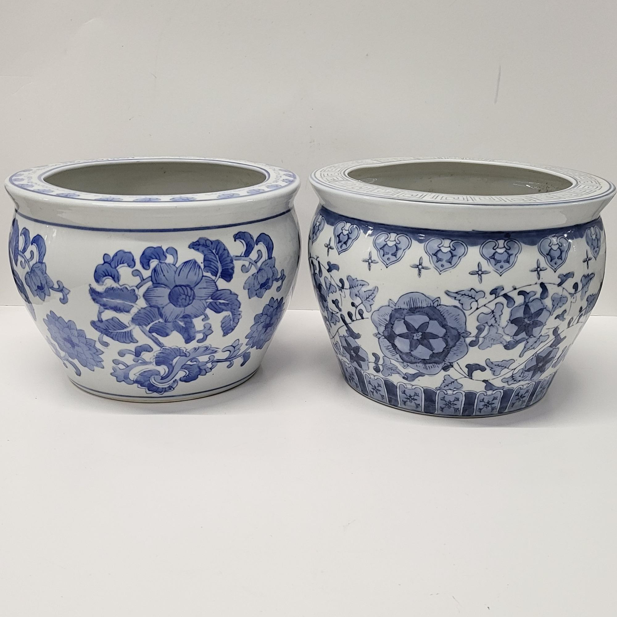 Chinese pots are both 10" diameter x 7" tall. Glazed pots with white & blue painted floral patterns.