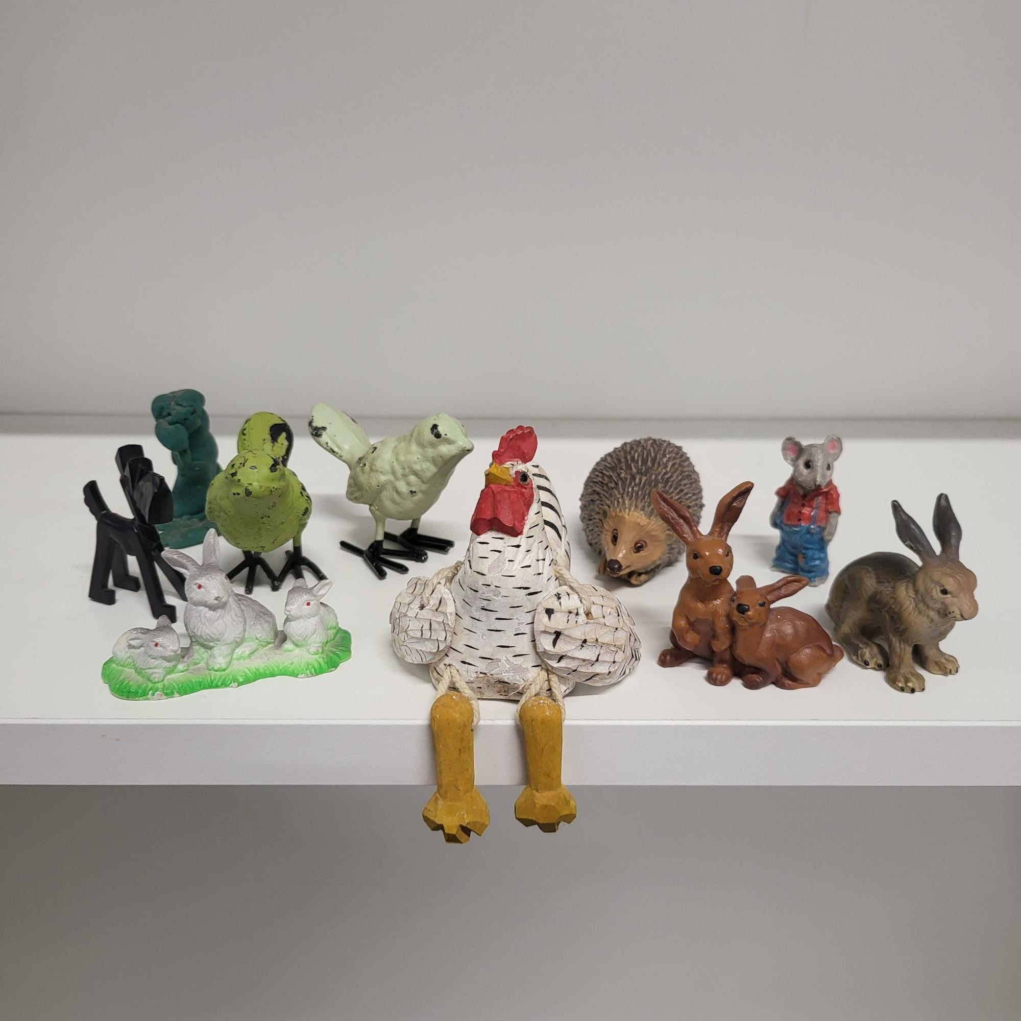 Lot of vintage/retro mini animal figurals. Pair of cast iron birds, wooden sitting chicken, plastic porcupine China, 1983 Bully Bunnies W.Germany, brown bunny Portugal, Germany, mouse and more. There are approximately 2"-2.5".