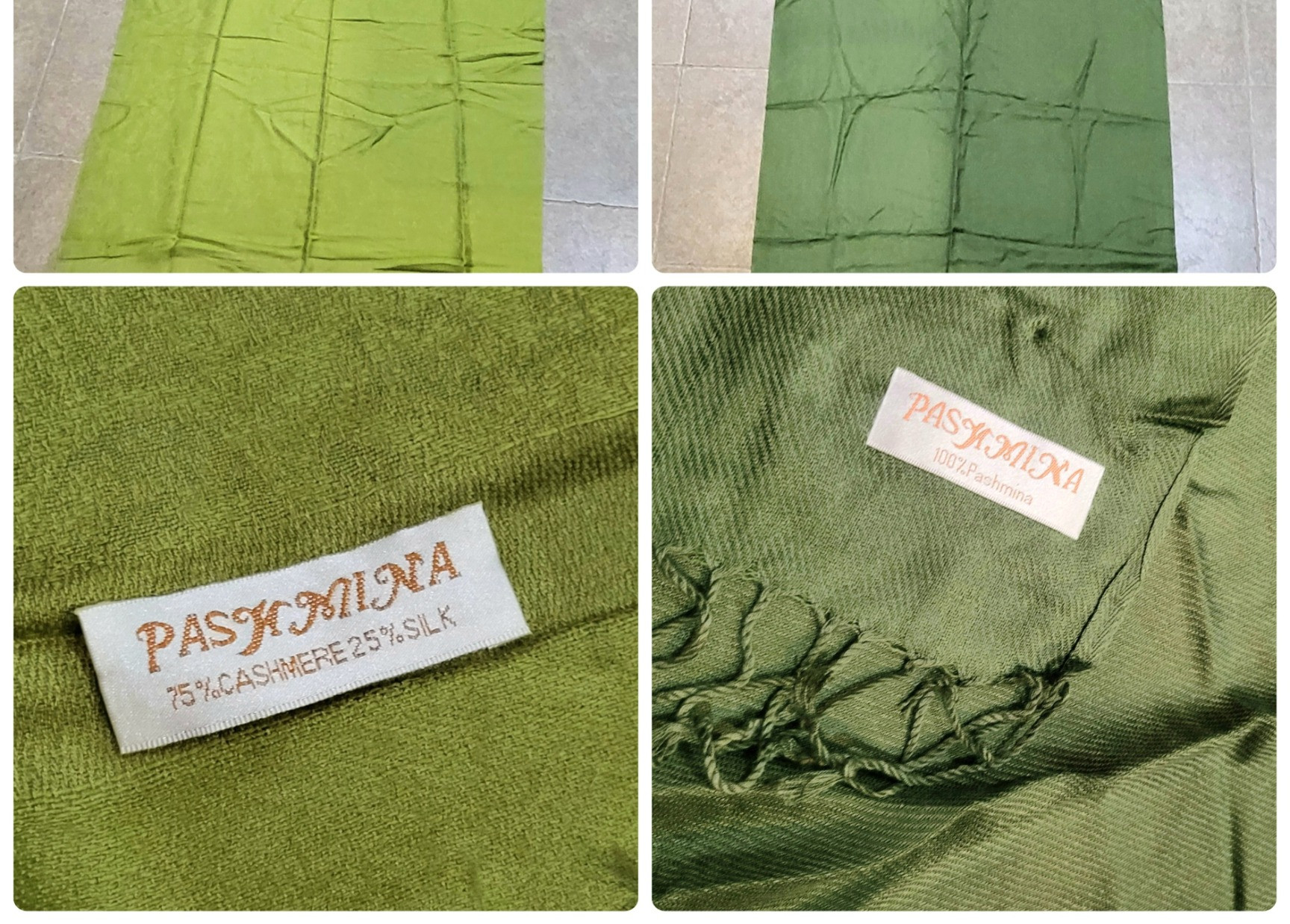 Two soft Pashmina wrap/scarves with knotted fringed ends. Shades of green. Both are 67" long x 26" wide. Darker one is 100% Pashmina. Lighter one is 75% Cashmere 25% Silk. Pashmina is a type of cashmere, but there is a slight difference between the two. Cashmere refers to the soft wool that comes from Cashmere goats, whereas pashmina specifically refers to the finest and softest fibers sourced from the undercoat of Himalayan mountain goats.