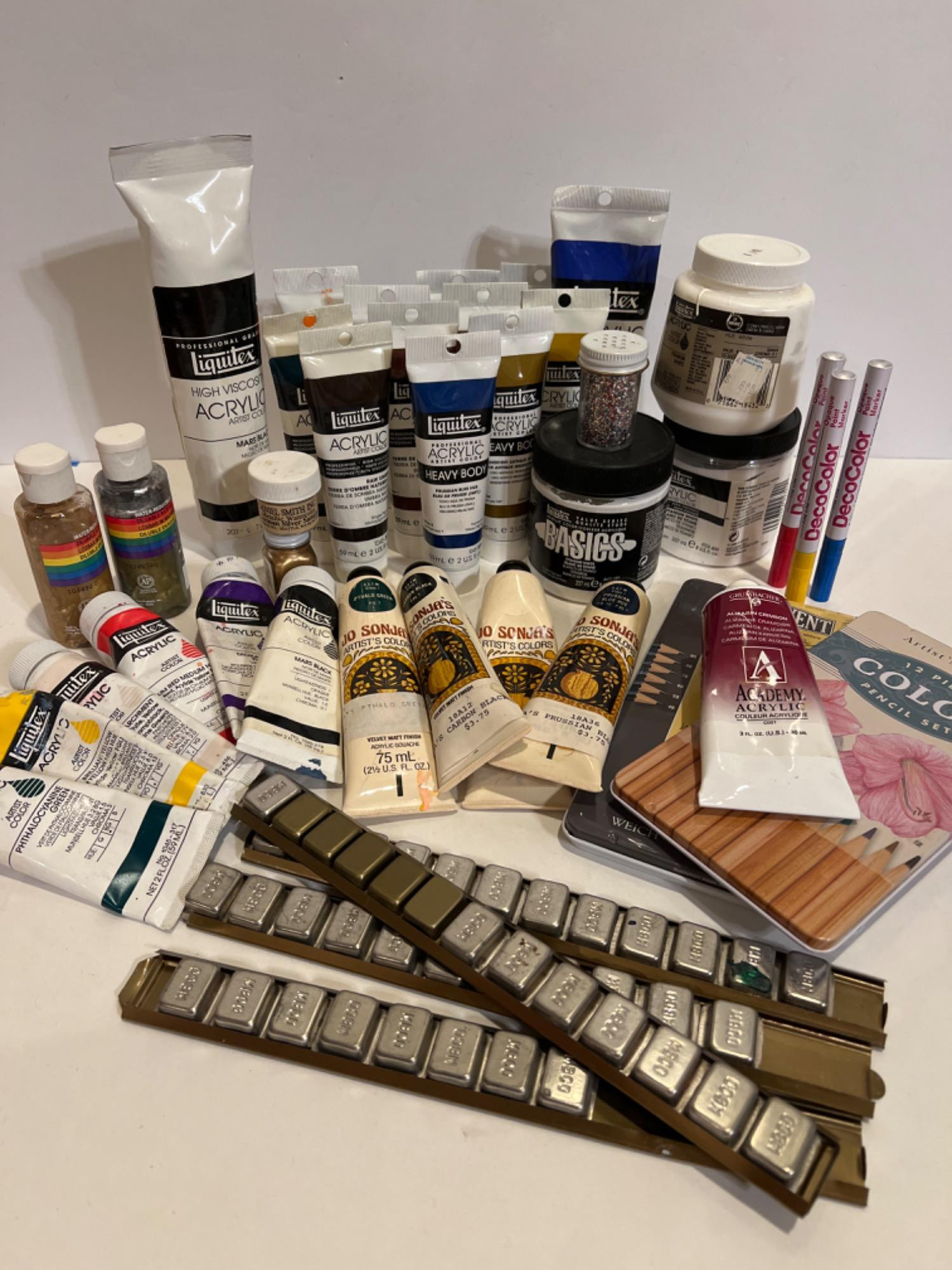 Variety of acrylic partially used and new paint tubes, art pencils, and watercolors and other art related materials.
