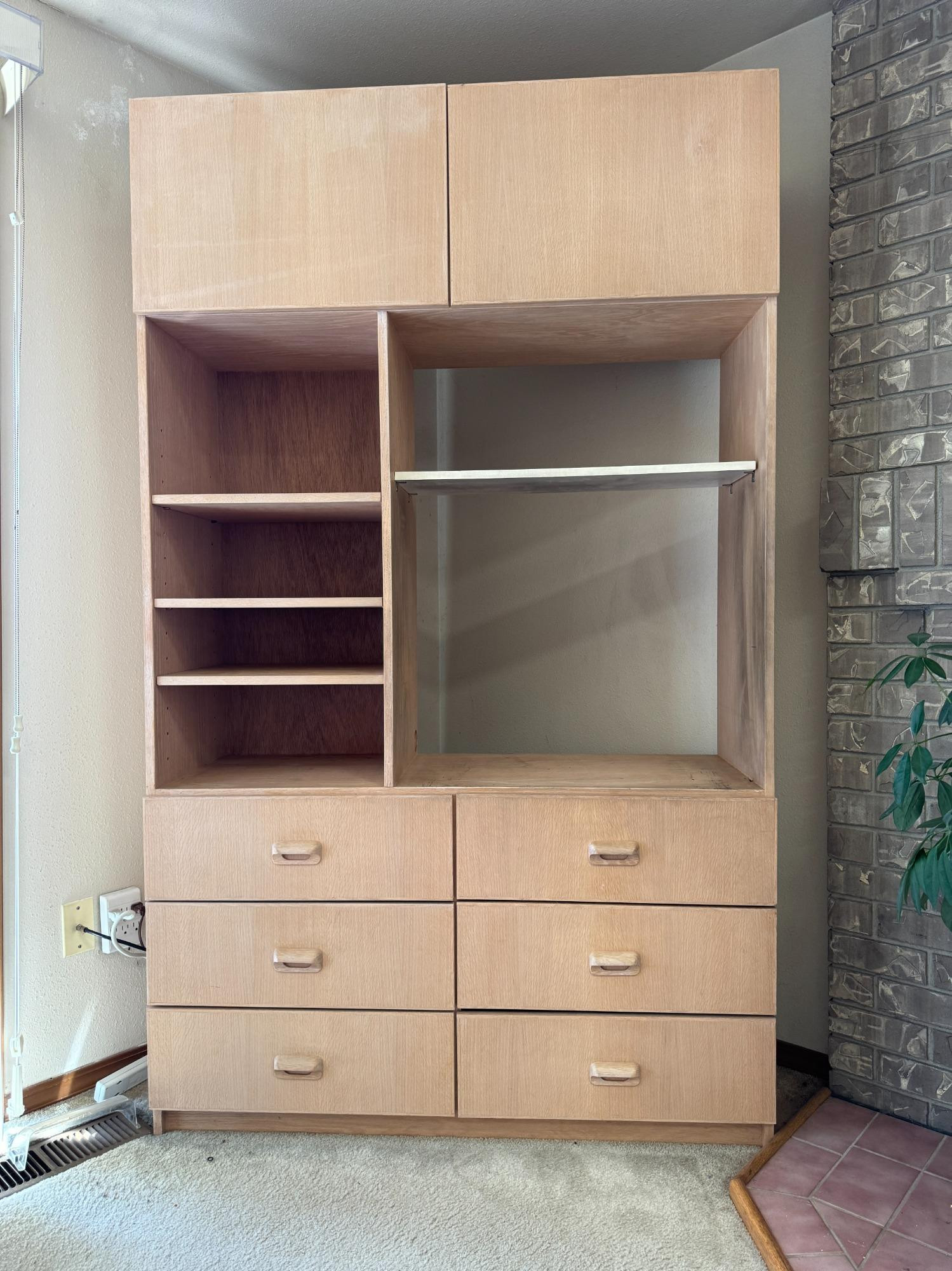 One piece Post Modern entertainment stand with whitewashed oak laminate on plywood frame. Has soot from neighboring fireplace that will need removed. Structurally sound. Measures 48 wide by 16.25 deep approximately 79 inches tall Bidding on this lot is an agreement that: (1.) You
