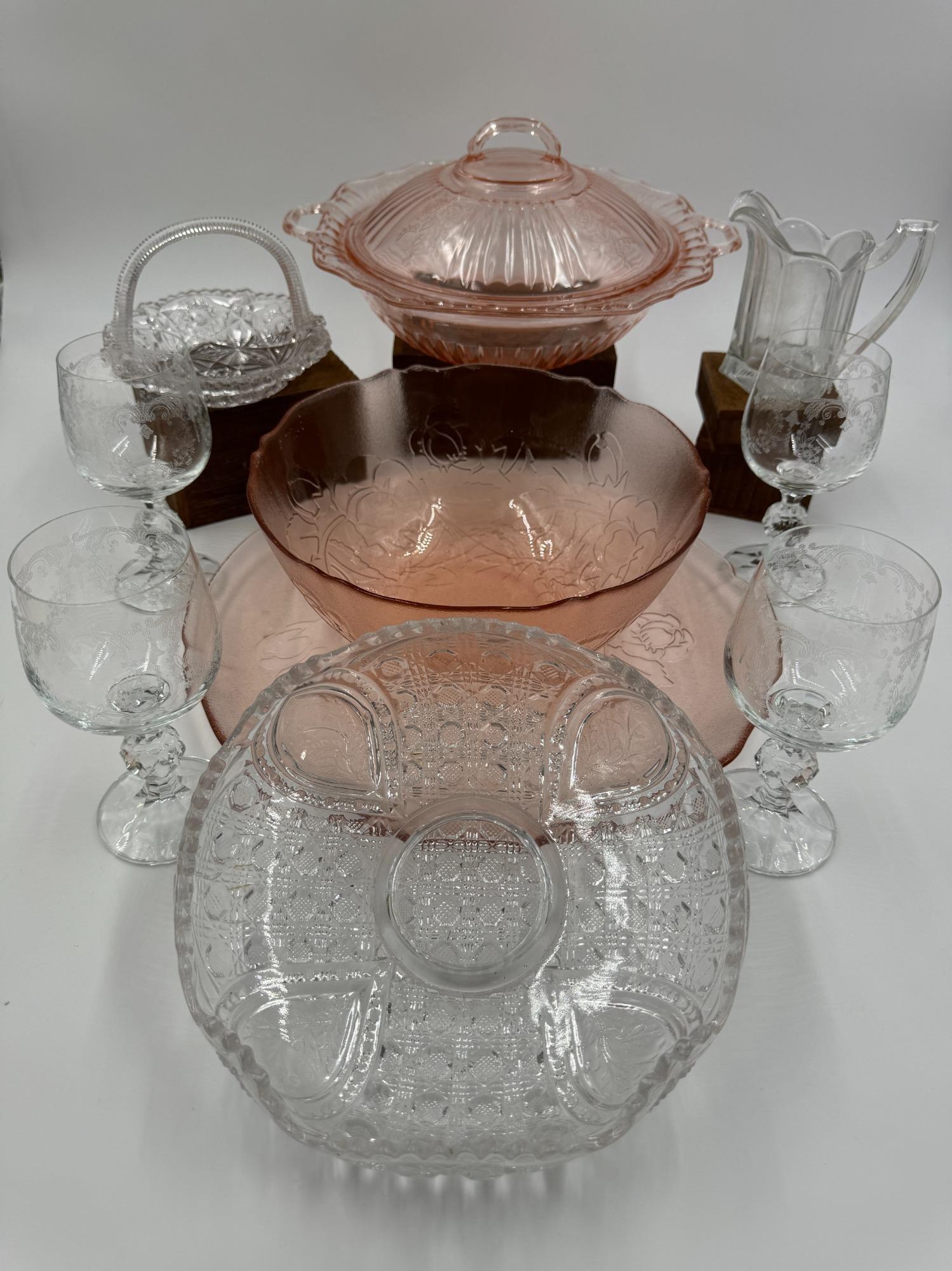 Pink Pressed Glass - EAPG Clear Basket - Etched Floral Stemware Pink rose plate 12.5”D with matching bowl Clear sawtooth pressed glass bowl 8.5”D x 3”T Pink lidded dish 11.75” handle to handle x 3”T - has rough spots Etched Stemware 5.75”T x 2.75”D