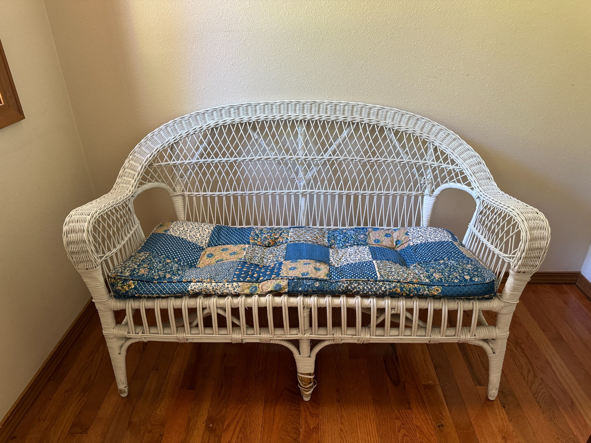 Lot # 76 - Vintage White Wicker Couch w/ Cute Retro Print Cushion