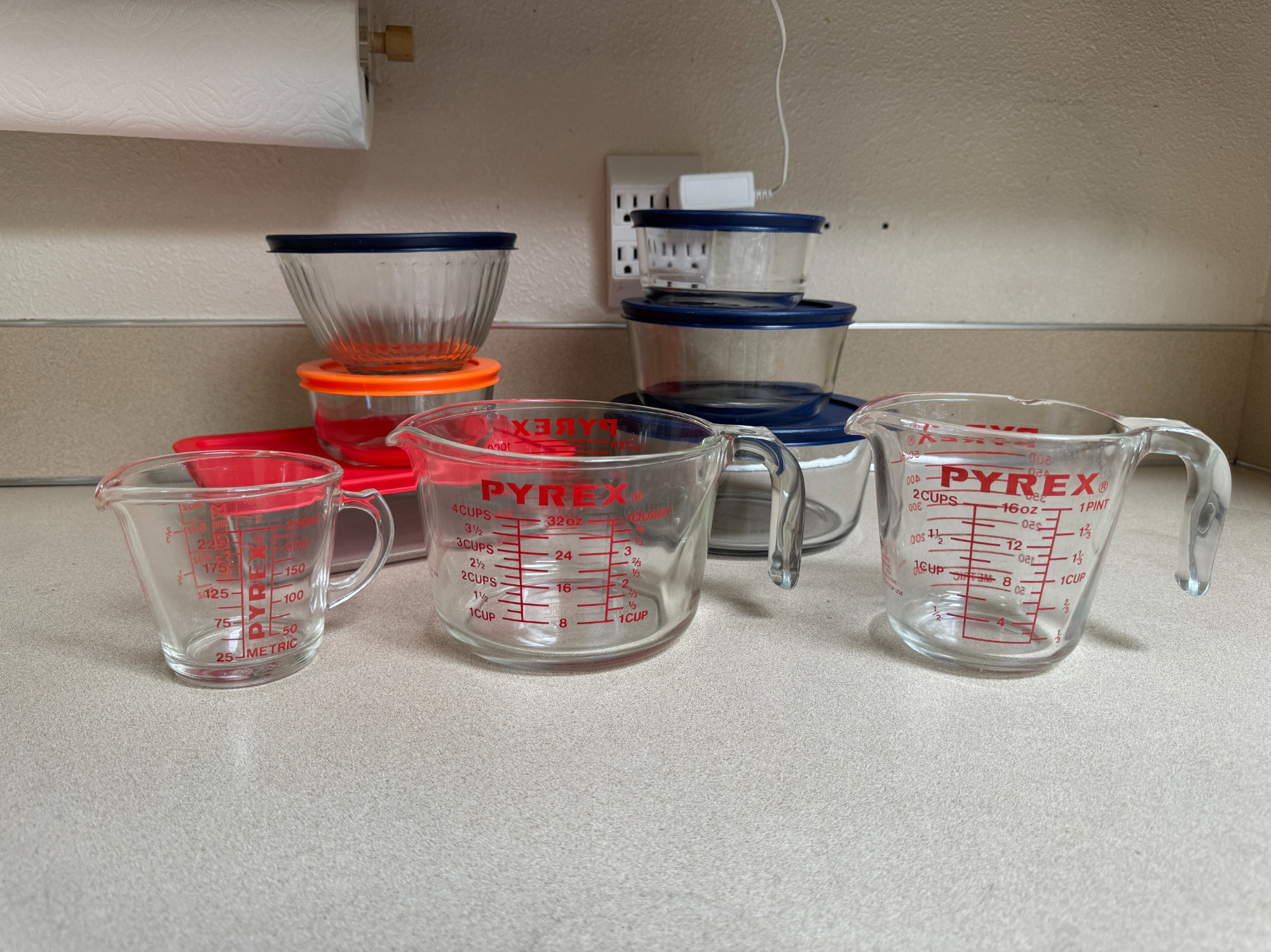 PYREX Measuring Cups & Pyrex Storage Containers 1, 2, & 4 cup PYREX measuring cups - 2 cup has chip to rim Lids for the pyrex containers appear to be in good condition