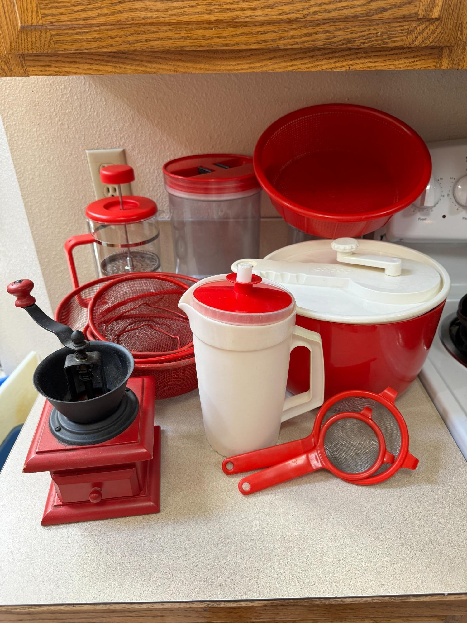 Lot # 90 - Post Mod Red Kitchen - Tupperware - Coffee Grinder - French Press +